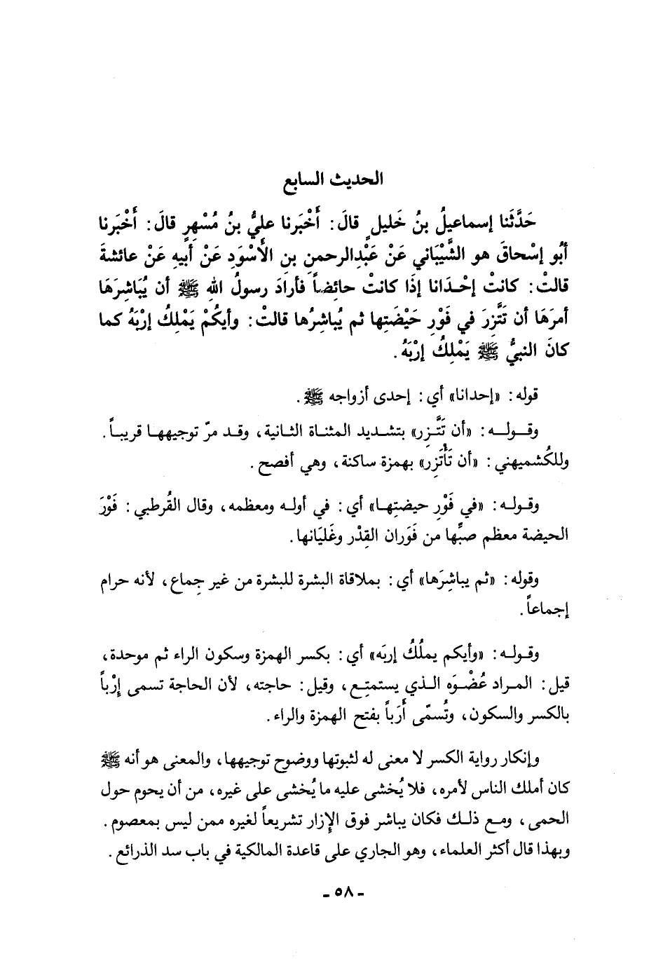 حَدَّثَنَا إِسْمَاعِيلُ بْنُ خَلِيلٍ قَالَ: أَخْبَرَنَا عَلِيُّ بْنُ مُسْهِرٍ قَالَ: أَخْبَرَنَا أَبُو إِسْحَاقَ هُوَ الشَّيْبَانِيُّ عَنْ عَبْدِ الرَّحْمَنِ بْنِ الأَسْوَدِ عَنْ أَبِيهِ عَنْ عَائِشَةَ قَالَتْ: كَانَتْ إِحْدَانَا إِذَا كَانَتْ حَائِضًا، فَأَرَادَ رَسُولُ اللَّهِ -صلى الله عليه وسلم- أَنْ يُبَاشِرَهَا، أَمَرَهَا أَنْ تَتَّزِرَ فِي فَوْرِ حَيْضَتِهَا ثُمَّ يُبَاشِرُهَا. قَالَتْ: وَأَيُّكُمْ يَمْلِكُ إِرْبَهُ كَمَا كَانَ النَّبِيُّ -صلى الله عليه وسلم- يَمْلِكُ إِرْبَهُ.