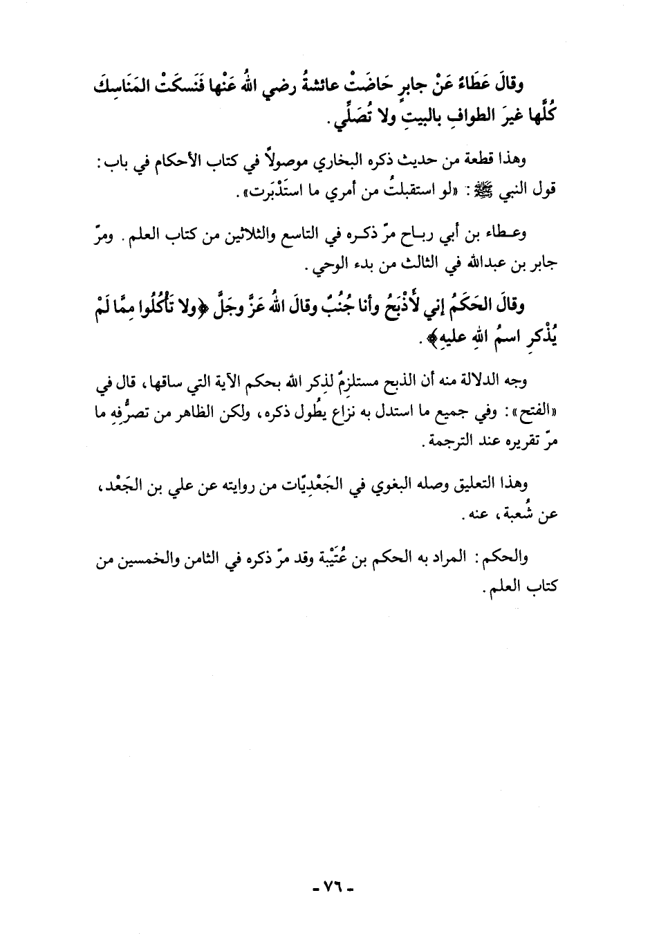 وقالَ عَطَاءٌ عَنْ جابرٍ حَاضَتْ عائشةُ رضي اللهُ عَنْها فَنَسكَتْ المَنَاسِكَ كُلَّها غيرَ الطوافِ بالبيتِ ولا تُصَلِّي.