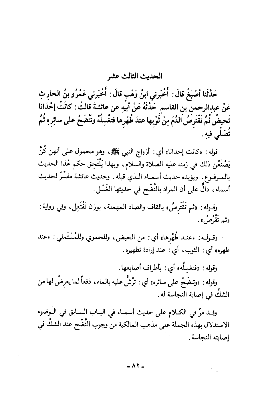 حَدَّثَنَا أَصْبَغُ قَالَ: أَخْبَرَنِي ابْنُ وَهْبٍ قَالَ: أَخْبَرَنِي عَمْرُو بْنُ الْحَارِثِ عَنْ عَبْدِ الرَّحْمَنِ بْنِ الْقَاسِمِ حَدَّثَهُ عَنْ أَبِيهِ عَنْ عَائِشَةَ قَالَتْ: كَانَتْ إِحْدَانَا تَحِيضُ، ثُمَّ تَقْتَرِصُ الدَّمَ مِنْ ثَوْبِهَا عِنْدَ طُهْرِهَا فَتَغْسِلُهُ، وَتَنْضَحُ عَلَى سَائِرِهِ، ثُمَّ تُصَلِّي فِيهِ.