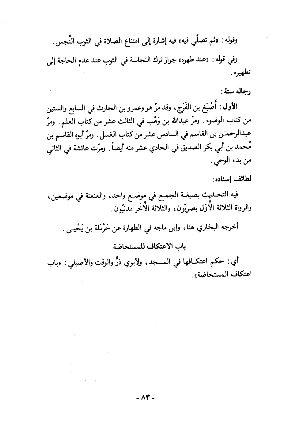 الأول: أَصْبَغ بن الفَرَج، وقد مرَّ هو وعمرو بن الحارث في السابع والستين من كتاب الوضوء. ومرَّ عبد الله بن وَهْب في الثالث عشر من كتاب العلم. ومرَّ عبد الرحمن بن القاسم في السادس عشر من كتاب الغسل. ومرَّ أبوه القاسم بن مُحمد بن أبي بكر الصديق في الحادي عشر منه أيضًا. ومرت عائشة في الثاني من بدء الوحي.