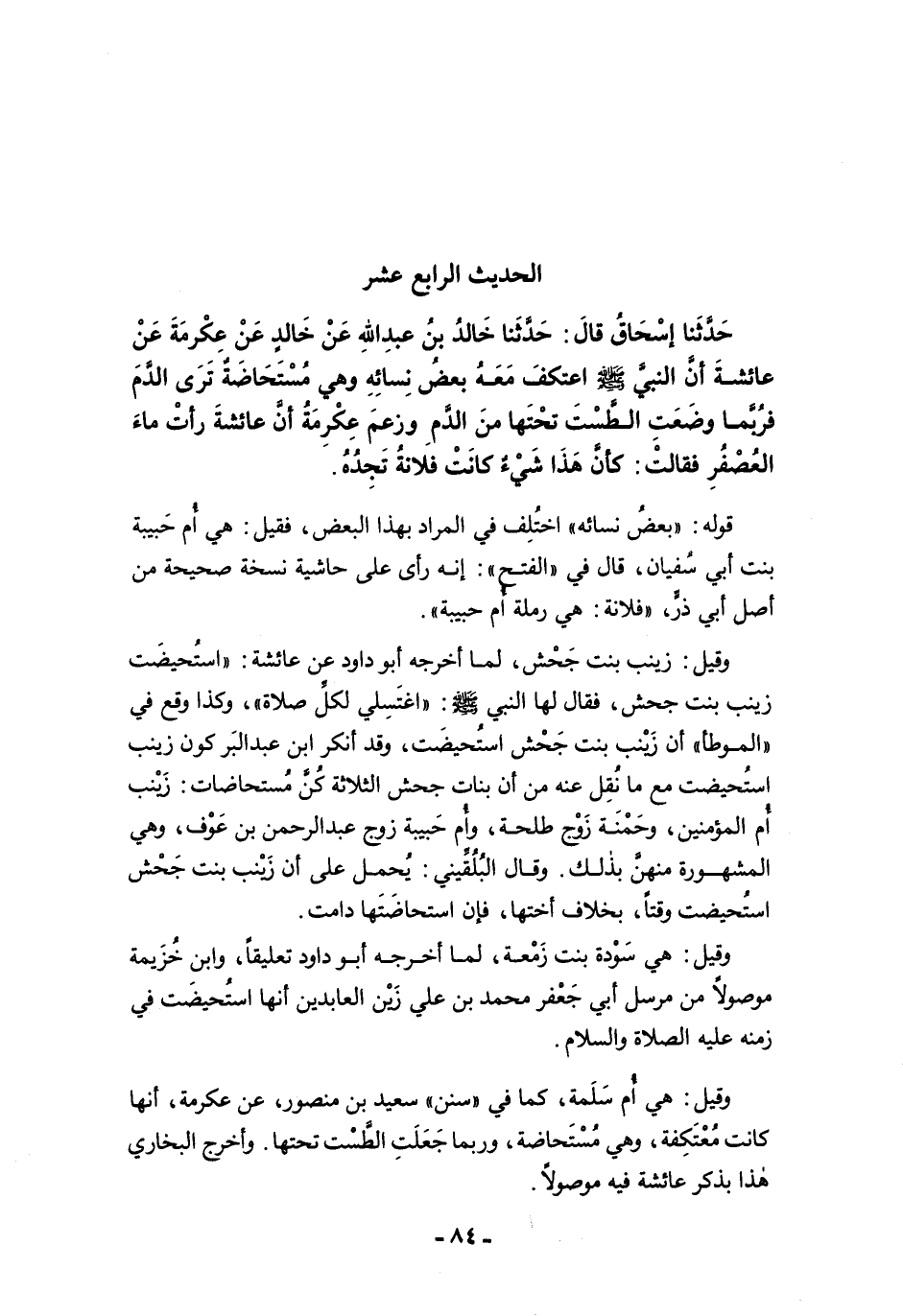 وقيل: زينب بنت جَحْش، لما أخرجه أبو داود عن عائشة: "استُحيضَت زينب بنت جحش، فقال لها النبي -صلى الله عليه وسلم-: "اغتَسِلي لكلِّ صلاة"، وكذا وقع في "الموطأ" أن زَيْنب بنت جَحْش استُحيضَت، وقد أنكر ابن عبد البَر كون زينب استُحيضت مع ما نُقِل عنه من أن بنات جحش الثلاثة كُنَّ مُستحاضات: زَيْنب أم المؤمنين، وحَمْنَة زَوْج طلحة، وأُم حَبيبة زوج عبد الرحمن بن عَوْف، وهي المشهورة منهنَّ بذلك. وقال البُلُقِّيني: يُحمل على أن زَيْنب بنت جَحْش استُحيضت وقتًا، بخلاف أختها، فإن استحاضَتَها دامت.