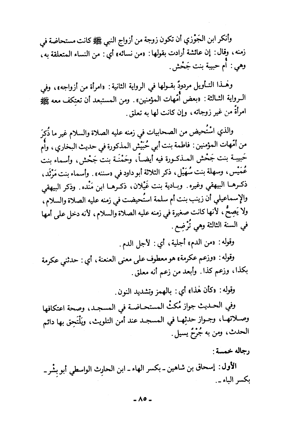 وأنكر ابن الجَوْزي أن تكون زوجة من أزواج النبي -صلى الله عليه وسلم- كانت مستحاضة في زمنه، وقال: إن عائشة أرادت بقولها: "من نسائه" أي: من النساء المتعلقة به، وهي: أُم حبيبة بنت جَحْش.