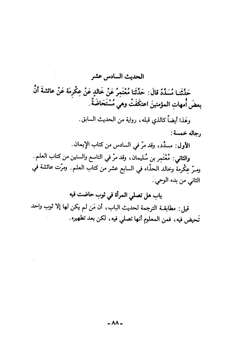 حَدَّثَنَا مُسَدَّدٌ قَالَ: حَدَّثَنَا مُعْتَمِرٌ عَنْ خَالِدٍ عَنْ عِكْرِمَةَ عَنْ عَائِشَةَ أَنَّ بَعْضَ أُمَّهَاتِ الْمُؤْمِنِينَ اعْتَكَفَتْ وَهْيَ مُسْتَحَاضَةٌ.