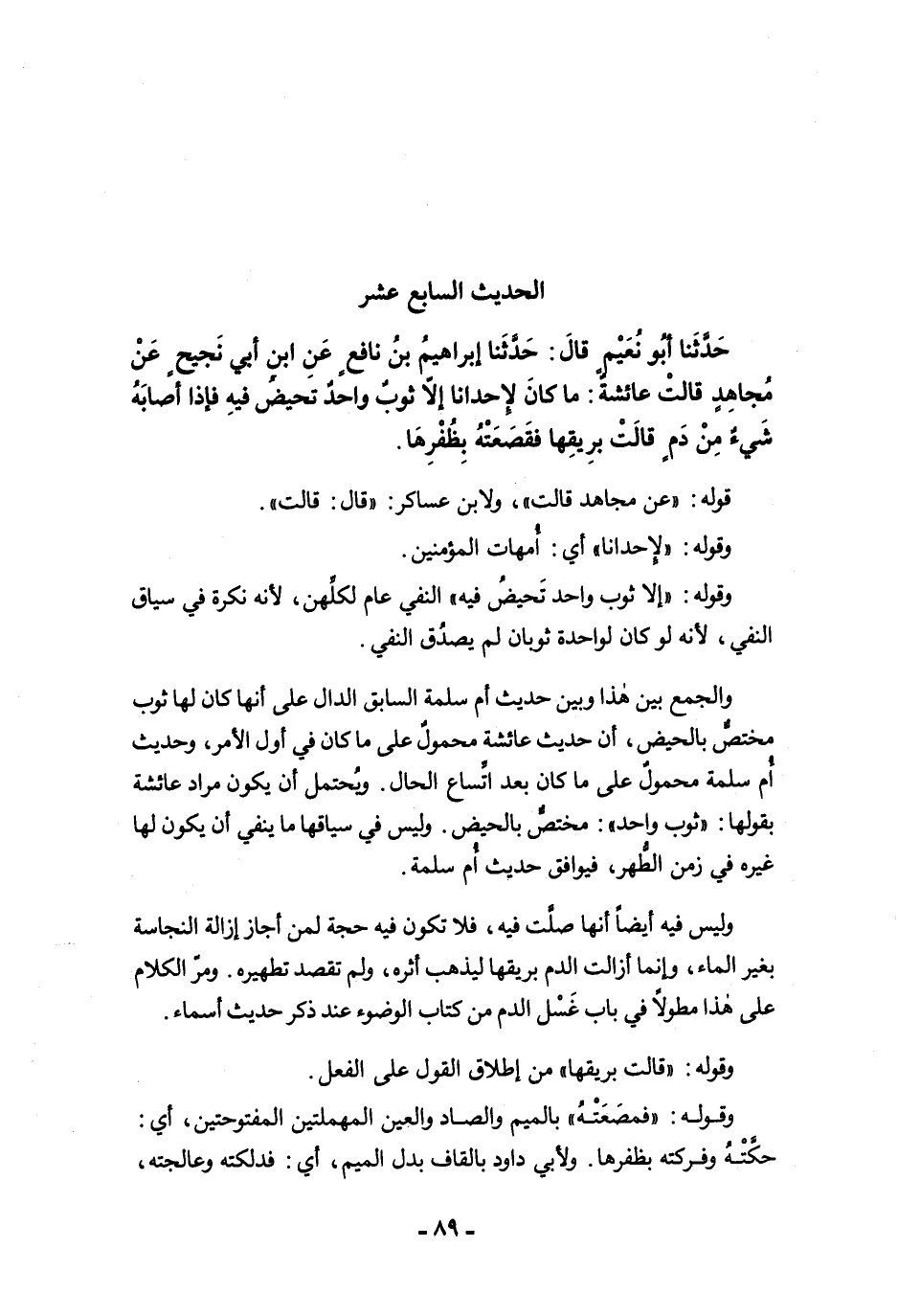 حَدَّثَنَا أَبُو نُعَيْمٍ قَالَ: حَدَّثَنَا إِبْرَاهِيمُ بْنُ نَافِعٍ عَنِ ابْنِ أَبِى نَجِيحٍ عَنْ مُجَاهِدٍ قَالَتْ عَائِشَةُ: مَا كَانَ لإِحْدَانَا إِلاَّ ثَوْبٌ وَاحِدٌ تَحِيضُ فِيهِ، فَإِذَا أَصَابَهُ شَيْءٌ مِنْ دَمٍ، قَالَتْ بِرِيقِهَا فَقَصَعَتْهُ بِظُفْرِهَا.