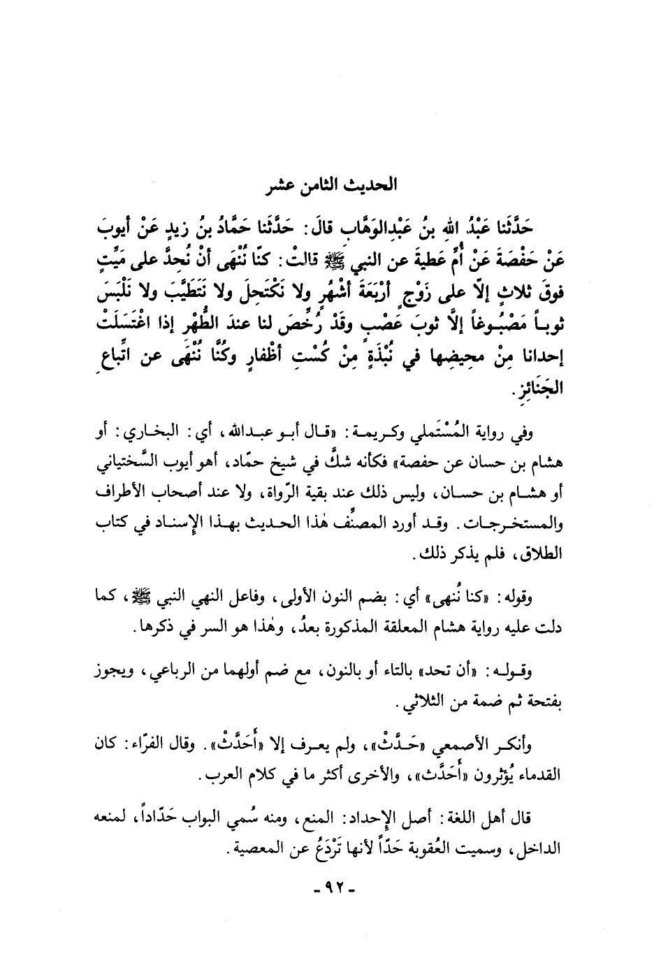 حَدَّثَنَا عَبْدُ اللَّهِ بْنُ عَبْدِ الْوَهَّابِ قَالَ: حَدَّثَنَا حَمَّادُ بْنُ زَيْدٍ عَنْ أَيُّوبَ عَنْ حَفْصَةَ عَنْ أُمِّ عَطِيَّةَ عَنْ النَّبيِّ -صلى الله عليه وسلم- قَالَتْ: كُنَّا نُنْهَى أَنْ نُحِدَّ عَلَى مَيِّتٍ فَوْقَ ثَلاَثٍ، إِلاَّ عَلَى زَوْجٍ أَرْبَعَةَ أَشْهُرٍ وَعَشْرًا، وَلاَ نَكْتَحِلَ وَلاَ نَتَطَيَّبَ وَلاَ نَلْبَسَ ثَوْبًا مَصْبُوغًا إِلاَّ ثَوْبَ عَصْبٍ، وَقَدْ رُخِّصَ لَنَا عِنْدَ الطُّهْرِ إِذَا اغْتَسَلَتْ إِحْدَانَا مِنْ مَحِيضِهَا فِي نُبْذَةٍ مِنْ كُسْتِ أَظْفَارٍ، وَكُنَّا نُنْهَى عَنِ اتِّبَاعِ الْجَنَائِزِ.