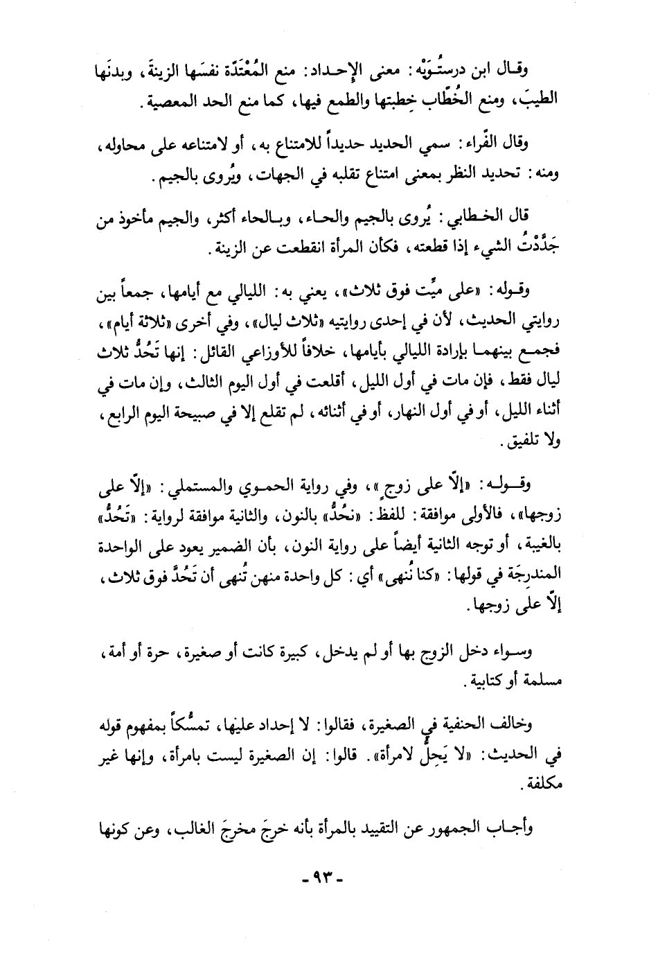 وقال ابن درستُوَيْه: معنى الإحداد: منع المُعْتَدّة نفسَها الزينةَ، وبدنَها الطيبَ، ومنع الخُطّاب خطبتها والطمع فيها، كما منع الحد المعصية.