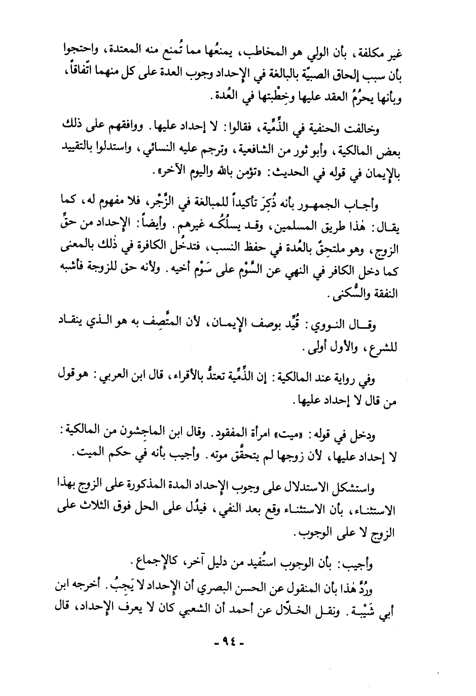 وأجاب الجمهور بأنه ذُكِرَ تأكيدًا للمبالغة في الزَّجْر، فلا مفهوم له، كما يقال: هذا طريق المسلمين، وقد يسلُكُه غيرهم. وأيضًا: الإحداد من حق الزوج، وهو ملتحِقٌ بالعُدة في حفظ النسب، فتدخُل الكافرة في ذلك بالمعنى كما دخل الكافر في النهي عن السَّوْم على سَوْم أخيه. ولأنه حق للزوجة فأشبه النفقة والسُّكنى.