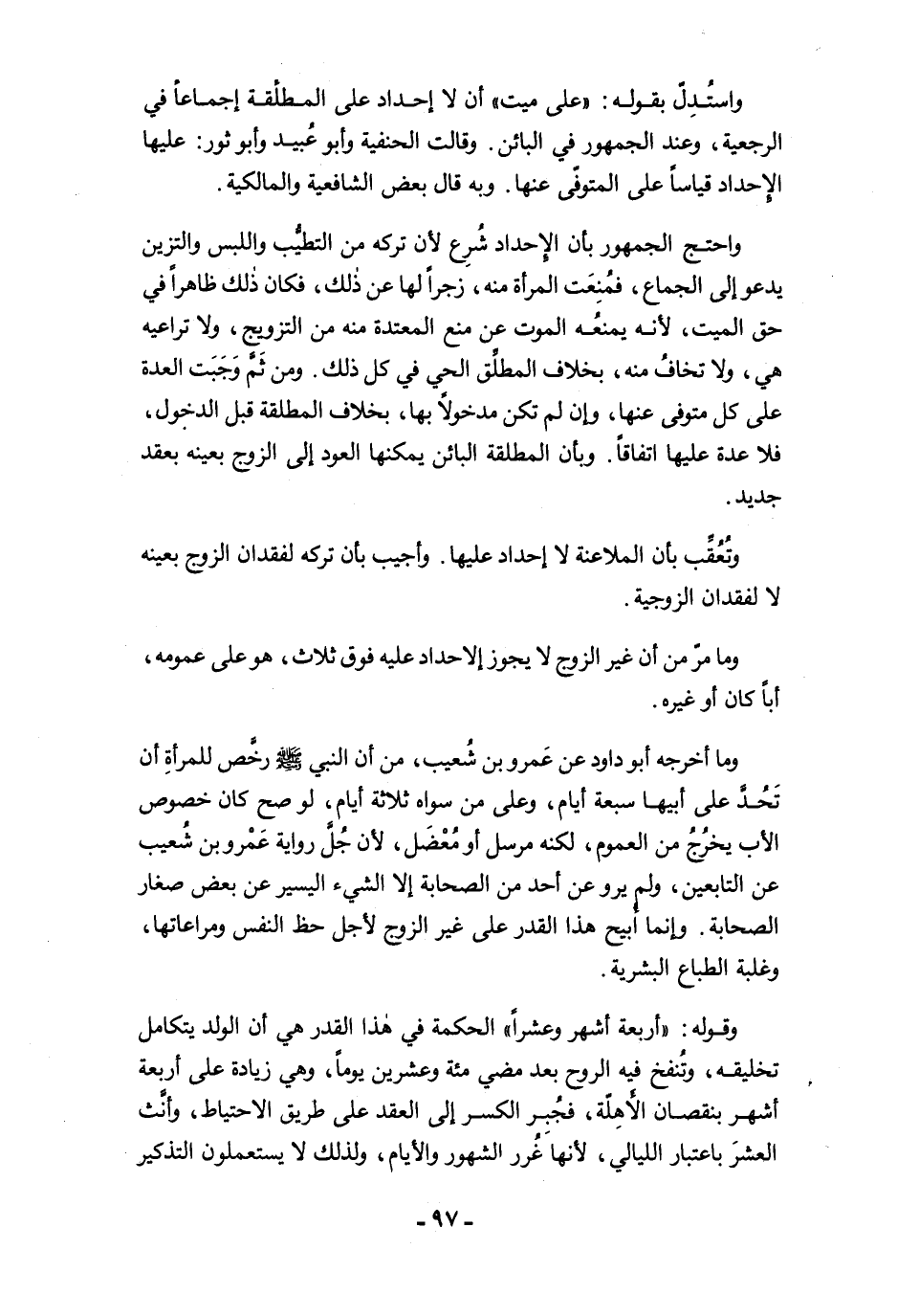 واحتج الجمهور بأن الإحداد شُرِع لأن تركه من التطيُّب واللبس والتزين يدعو إلى الجماع، فمُنِعَت المرأة منه، زجرًا لها عن ذلك، فكان ذلك ظاهرًا في حق الميت؛ لأنه يمنعُه الموت عن منع المعتدة منه من التزويج، ولا تراعيه هي، ولا تخافُ منه، بخلاف المطلِّق الحي في كل ذلك. ومن ثَمَّ وَجَبَت العدة على كل متوفى عنها، وإن لم تكن مدخولًا بها، بخلاف المطلقة قبل الدخول، فلا عدة عليها اتفاقًا. وبأن المطلقة البائن يمكنها العود إلى الزوج بعينه بعقد جديد.
