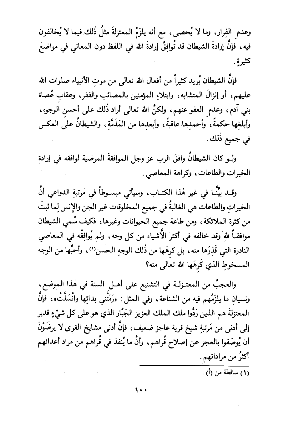 والعجبُ من المعتزلة في التشنيع على أهل السنة في هذا الموضع، ونسيان ما يلزمهم فيه من الشناعة، وفي المثل: " رَمَتْني بدائِها وانْسَلَّتْ "، فإن المعتزلة هم الذين ردُّوا ملك الملك العزيز الجبار الذي هو على كل شيءٍ قدير إلى أدنى من مرتبة شيخ قرية عاجز ضعيف، فإن أدنى مشايخ القرى لا يرضون أن يُوصفوا بالعجز عن إصلاح قُراهم، وأن ما يُنفذ في قُراهم من مراد أعدائهم أكثرُ من مراداتهم.