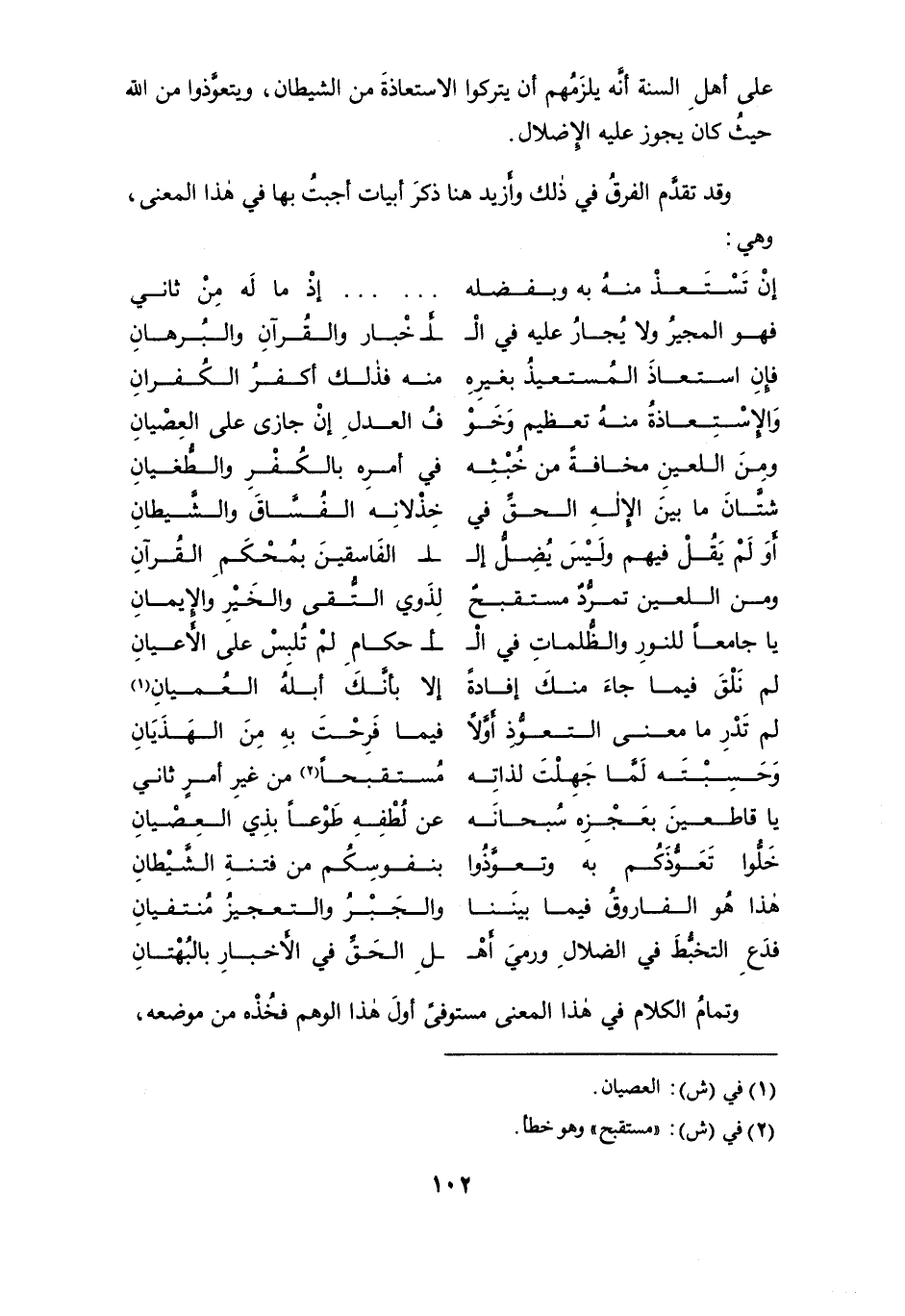 على أهلِ السنة أنه يلزمهم أن يتركوا الاستعاذة من الشيطان، ويتعوذوا من الله حيث كان يجوز عليه الإضلال.