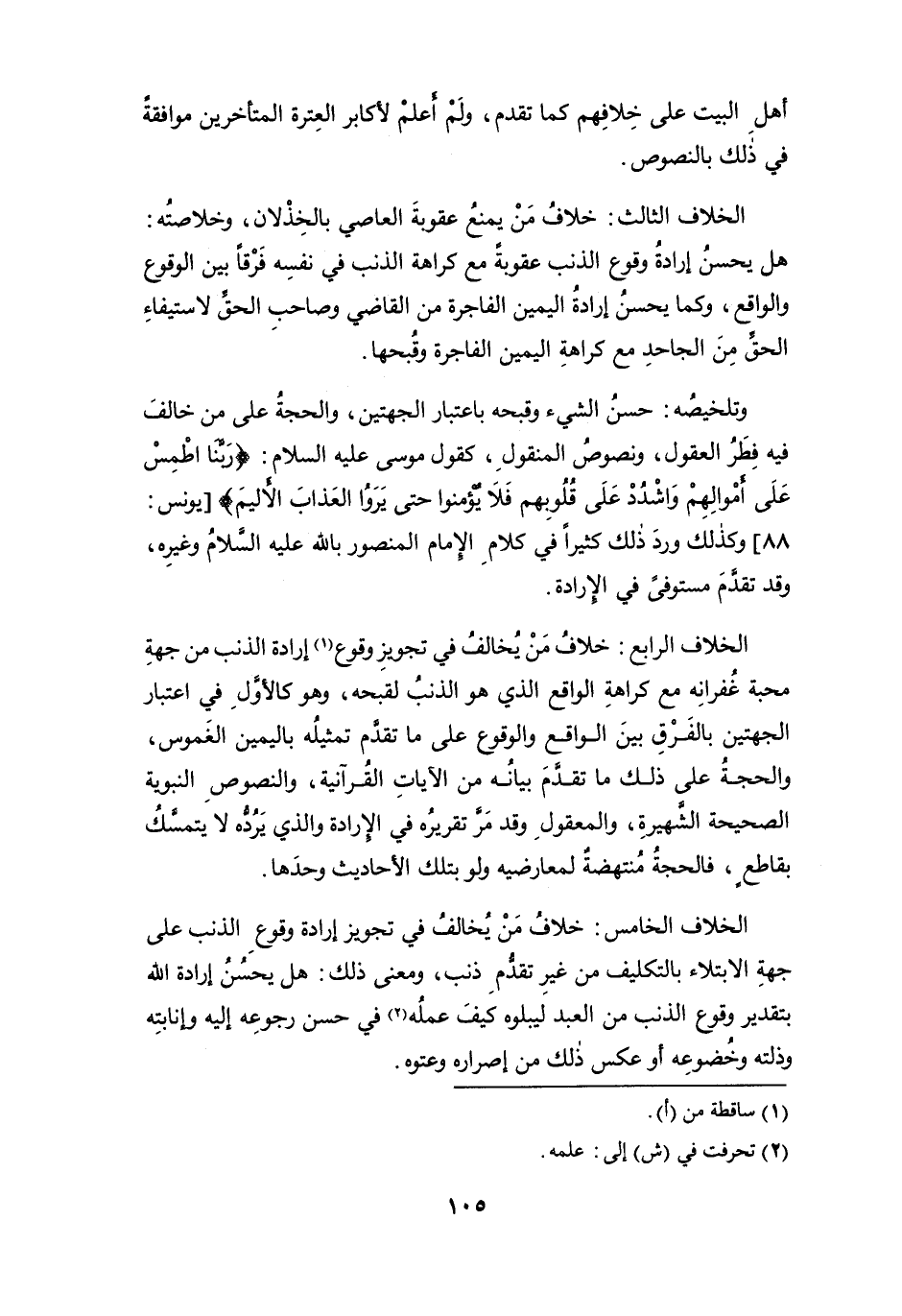 الخلاف الخامس: خلاف من يخالف في تجويز إرادة وقوع الذنب على جهة الابتلاء بالتكليف من غير تقدُّم ذنب، ومعنى ذلك: هل يحسن إرادة الله بتقدير وقوع الذنب من العبد ليبلوه كيف عمله (¬2) في حسن رجوعه إليه وإنابته وذلته وخُضوعه أو عكس ذلك من إصراره وعتوه.