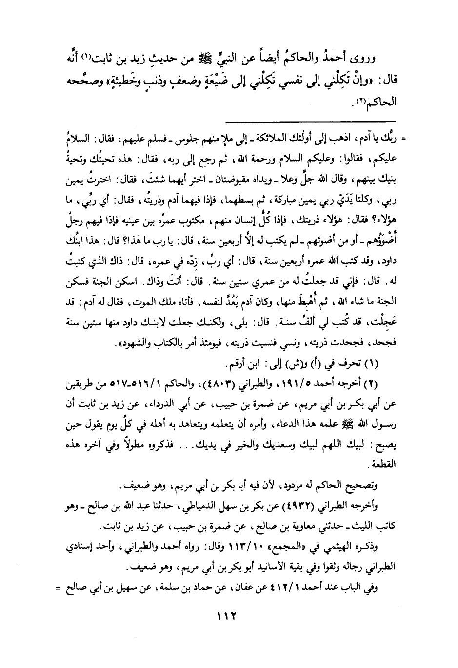 = ربُّك يا آدم، اذهب إلى أولئك الملائكة -إلى ملإ منهم جلوس- فسلم عليهم، ققال: السلام عليكم، فقالوا: وعليكم السلام ورحمة الله، ثم رجع إلى ربه، فقال: هذه تحيتك وتحية بنيك بينهم، وقال الله جل وعلا -ويداه مقبوضتان- اختر أيهما شئت، فقال: اخترت يمين ربي، وكلتا يدي ربي يمين مباركة، ثم بسطهما، فإذا فيهما آدم وذريته، فقال: أي ربِّي، ما هؤلاء؟ فقال: هؤلاء ذريتك، فإذا كل انسان منهم، مكتوب عمره بين عينيه فإذا فيهم رجل أضْوَؤُهم -أو من أضوئهم- لم يكتب له إلاَّ أربعين سنة، قال: يا رب ما هذا؟ قال: هذا ابنك داود، وقد كتب الله عمره أربعين سنة، قال: أي ربِّ، زِدْه في عمره، قال: ذاك الذي كتبت له. قال: فإني قد جعلتُ له من عمري ستين سنة. قال: أنت وذاك. اسكن الجنة فسكن الجنة ما شاء الله، ثم أَهْبِطَ منها، وكان آدم يعُدَّ لنفسه، فأتاه ملك الموت، فقال له آدم: قد عَجِلْت، قد كُتب لي ألف سنة. قال: بلى، ولكنك جعلت لابنك داود منها ستين سنة فجحد، فجحدت ذريته، ونسي فنسيت ذريته، فيومئذ أمر بالكتاب والشهود ".