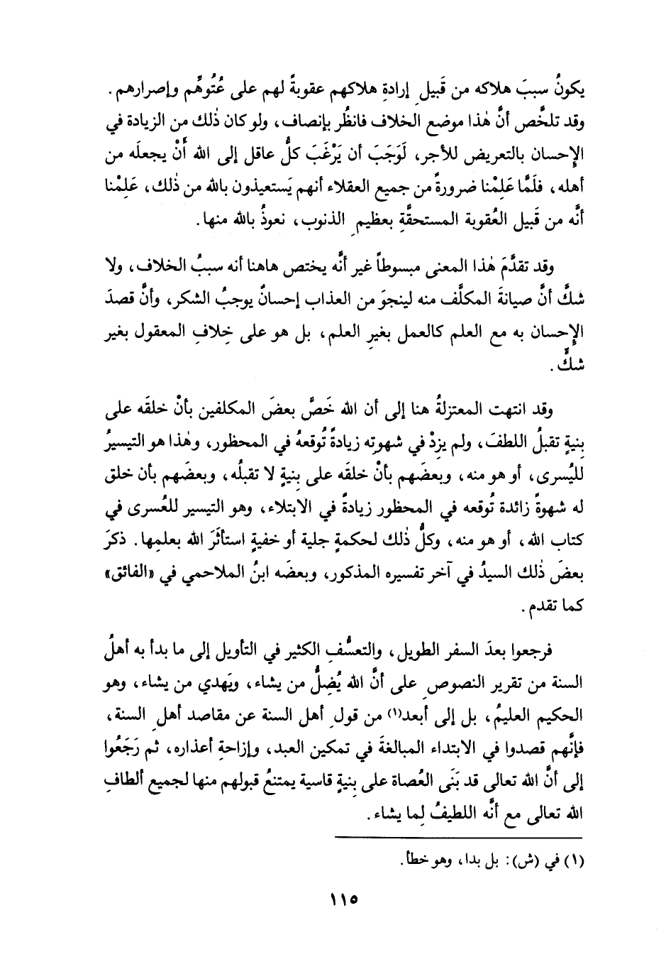 فرجعوا بعد السفر الطويل، والتعسُّف الكثير في التأويل إلى ما بدأ به أهلُ السنة من تقرير النصوص على أن الله يضل من يشاء، ويهدي من يشاء، وهو الحكيم العليم، بل إلى أبعد (¬1) من قول أهل السنة عن مقاصد أهل السنة، فإنهم قصدوا في الابتداء المبالغة في تمكين العبد، وإزاحة أعذاره، ثم رجعوا إلى أن الله تعالى قد بنى العصاة على بِنيةٍ قاسية يمتنع قبولهم منها لجميع ألطاف الله تعالى مع أنه اللطيف لما يشاء.