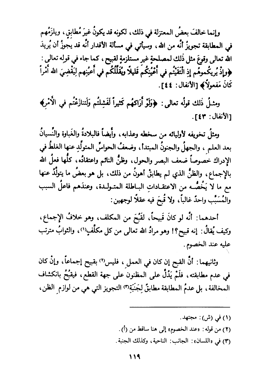 وإنما خالف بعض المعتزلة في ذلك، لكونه قد يكون غير مُطابِقٍ، ويلزمهم في المطابقة تجويز أنه من الله، وسيأتي في مسألة الأقدار إنه قد يجوز أن يريد الله تعالى وقوع مثل ذلك لمصلحةٍ غير مستلزمةٍ لقبيح، كما جاء في قوله تعالى: {وَإِذْ يُرِيكُمُوهُمْ إِذِ الْتَقَيْتُمْ فِي أَعْيُنِكُمْ قَلِيلًا وَيُقَلِّلُكُمْ فِي أَعْيُنِهِمْ لِيَقْضِيَ اللَّهُ أَمْرًا كَانَ مَفْعُولًا} [الأنفال: 44].