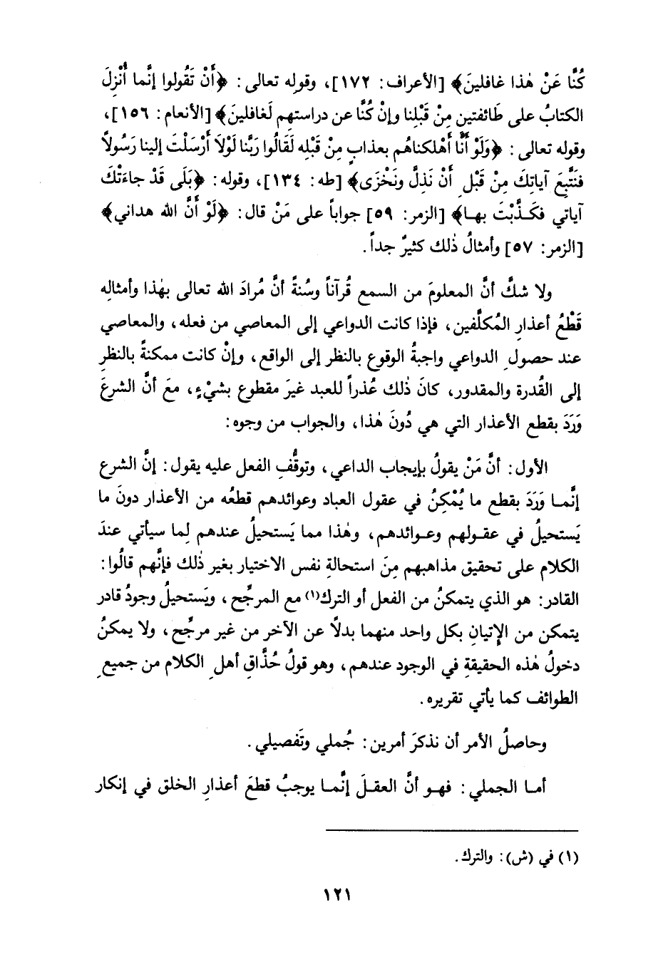 ولا شكَّ أن المعلوم من السمع قرآناً وسُنةً أن مراد الله تعالى بهذا وأمثاله قَطْعُ أعذار المُكلَّفين، فإذا كانت الدواعي إلى المعاصي من فعله، والمعاصي عند حصول الدواعي واجبة الوقوع بالنظر إلى الواقع، وإن كانت ممكنة بالنظر إلى القدرة والمقدور، كان ذلك عُذراً للعبد غير مقطوع بشيءٍ، مع أنَّ الشرع ورد بقطع الأعذار التي هي دُون هذا، والجواب من وجوه: