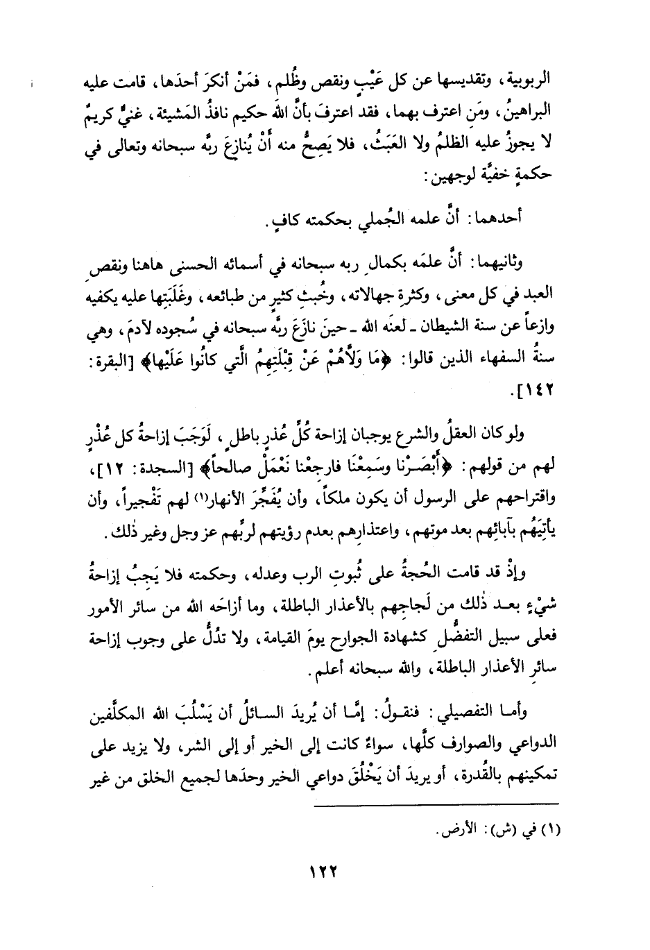 الربوبية، وتقديسها عن كل عيبٍ ونقص وظُلم، فمن أنكر أحدها، قامت عليه البراهينُ، ومن اعترف بهما، فقد اعترف بأن الله حكيم نافذ المشيئة، غنيٌّ كريم لا يجوز عليه الظلم ولا العبث، فلا يصح منه أن يُنازع ربه سبحانه وتعالى في حكمةٍ خفية لوجهين: