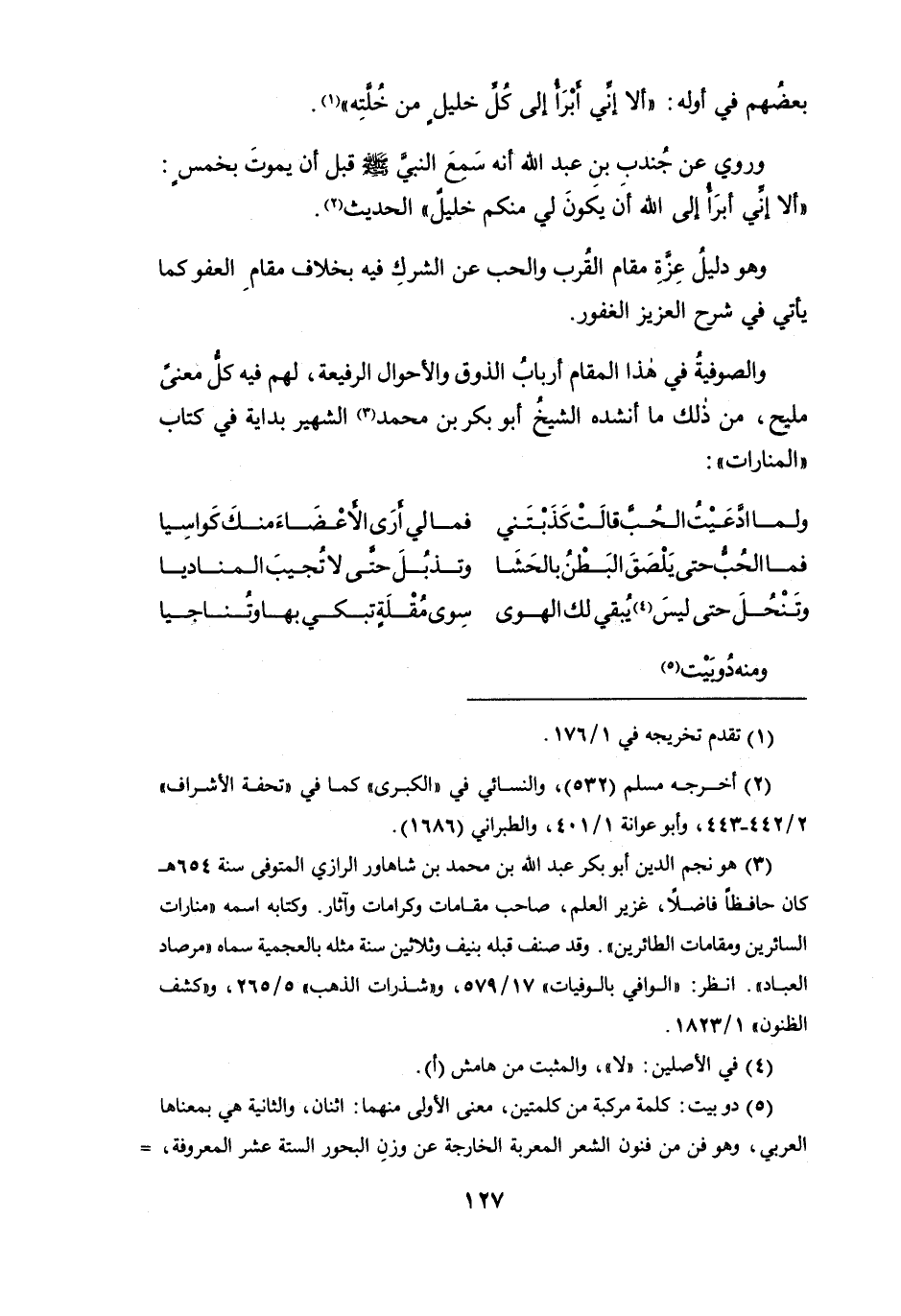 (¬3) هو نجم الدين أبو بكر عبد الله بن محمد بن شاهاور الرازي المتوفى سنة 654 هـ كان حافظاً فاضلاً، غزير العلم، صاحب مقامات وكرامات وآثار. وكتابه اسمه " منارات السائرين ومقامات الطائرين ". وقد صنف قبله بنيف وثلاثين سنة مثله بالعجمية سماه " مرصاد العباد ". انظر: " الوافي بالوفيات " 17/ 579، و" شذرات الذهب " 5/ 265، و" كشف الظنون " 1/ 1823.