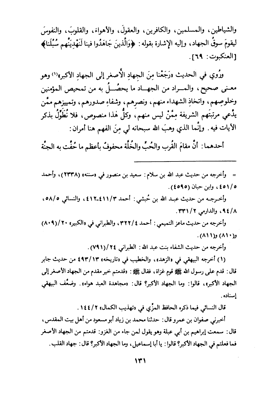 (¬1) أخرجه البيهقي - صلى الله عليه وسلم - في " الزهد "، والخطيب في " تاريخه " 13/ 493 من حديث جابر قال: قدم على رسول الله - صلى الله عليه وسلم - قوم غزاة، فقال - صلى الله عليه وسلم -: " قدمتم خير مقدم من الجهاد الأصغر إلى الجهاد الأكبر "، قالوا: وما الجهاد الأكبر؟ قال: " مجاهده العبد هواه ". وضعَّف البيهقي إسناده.
