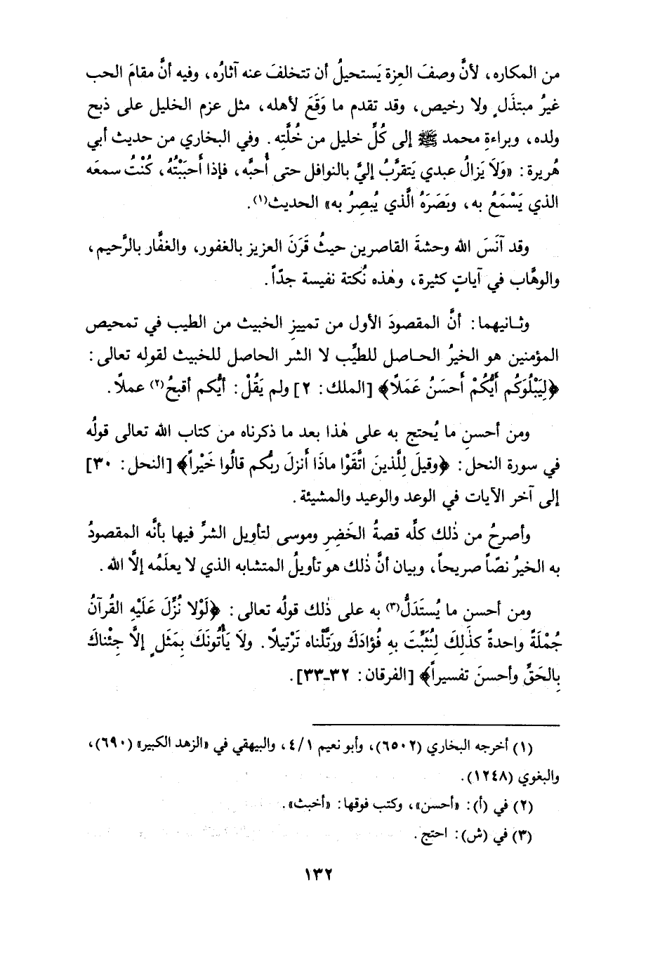 من المكاره، لأن وصف العزة يستحيلُ أن تتخلفَ عنه آثاره، وفيه أن مقام الحب غير مبتذلٍ ولا رخيص، وقد تقدم ما وقع لأهله، مثل عزم الخليل على ذبح ولده، وبراءة محمد - صلى الله عليه وسلم - إلى كل خليل من خُلَّتِه. وفي البخاري من حديث أبي هريرة: " ولا يزال عبدي يتقرَّبُ إليَّ بالنوافل حتى أُحبه، فإذا أحببتُهُ، كنت سمعه الذي يسمع به، ويصره الذي يبصر به " الحديث (¬1).