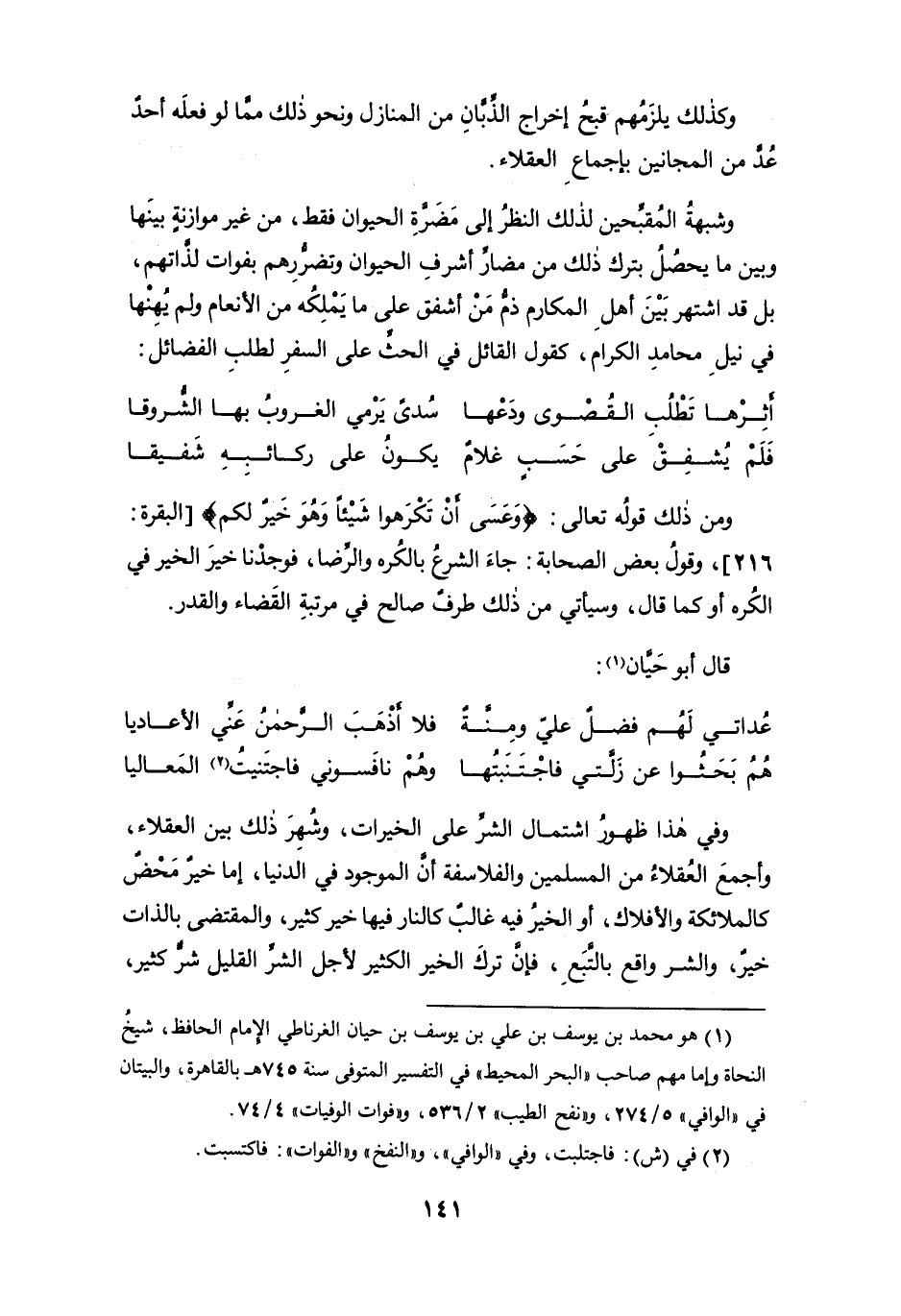 (¬1) هو محمد بن يوسف بن علي بن يوسف بن حيان الغرناطي الإمام الحافظ، شيخُ النحاة وإمامهم صاحب " البحر المحيط " في التفسير المتوفى سنة 745 هـ بالقاهرة، والبيتان في " الوافي " 5/ 274، و" نفح الطيب " 2/ 536، و" فوات الوفيات " 4/ 74.