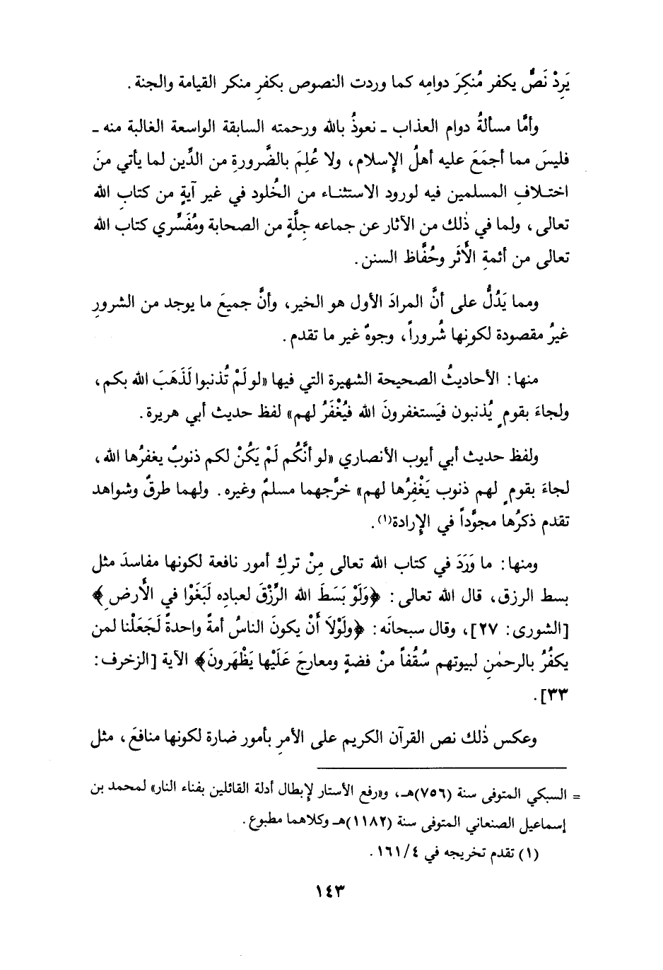 = السبكي المتوفى سنة (756) هـ، و" رفع الأستار لإبطال أدلة القائلين بفناء النار " لمحمد بن إسماعيل الصنعاني المتوفى سنة (1182) هـ وكلاهما مطبوع.