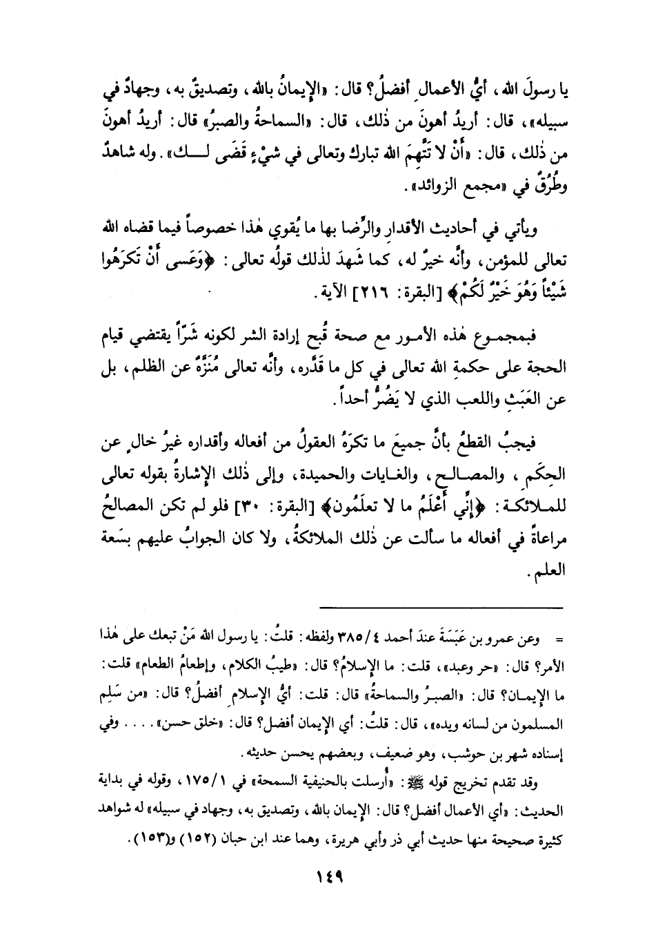 يا رسول الله، أيُّ الأعمال أفضل؟ قال: " الإيمان بالله، وتصديقٌ به، وجهادٌ في سبيله "، قال: أريد أهون من ذلك، قال: " السماحة والصبر " قال: أريدُ أهون من ذلك، قال: " أن لا تَتَّهِم الله تبارك وتعالى في شيءٍ قَضَى لك ". وله شاهدٌ وطُرُقٌ في " مجمع الزوائد ".