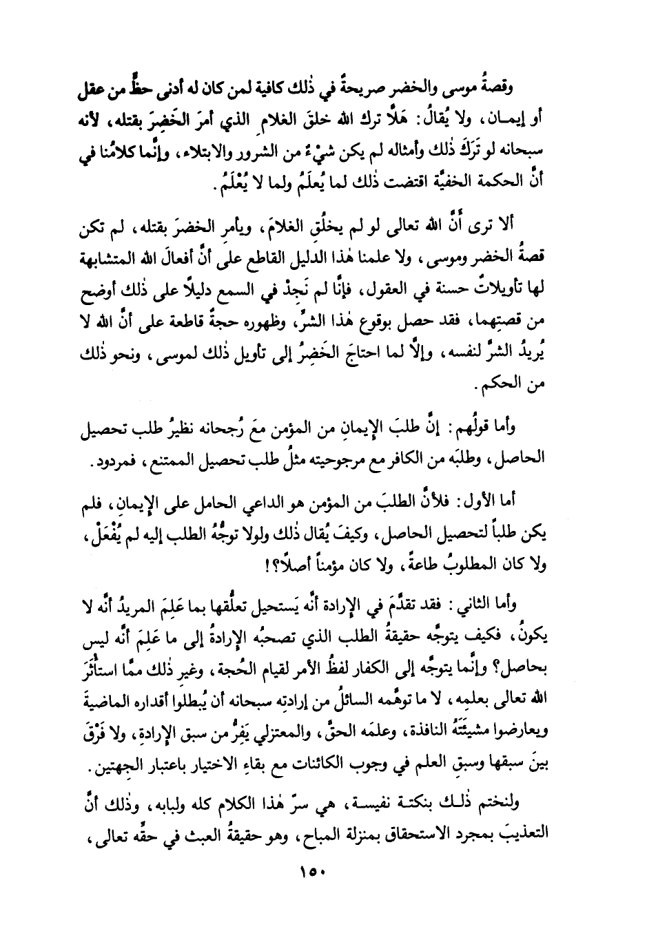 ألا ترى أن الله تعالى لو لم يخلُقِ الغلام، ويأمر الخضر بقتله، لم تكن قصة الخضر وموسى، ولا علمنا هذا الدليل القاطع على أن أفعال الله المتشابهة لها تأويلاتٌ حسنة في العقول، فإنا لم نَجِدْ في السمع دليلاً على ذلك أوضح من قصتهما، فقد حصل بوقوع هذا الشر، وظهوره حجةٌ قاطعة على أن الله لا يريد الشر لنفسه، وإلا لما احتاج الخَضِر إلى تأويل ذلك لموسى، ونحو ذلك من الحكم.