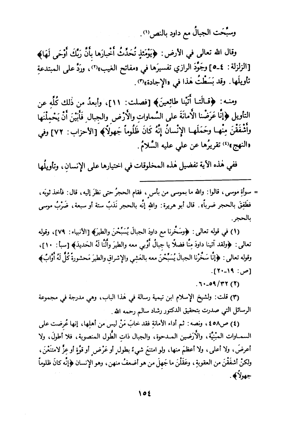 وقال الله تعالى في الأرض: {يَوْمَئِذٍ تُحَدِّثُ أَخْبَارَهَا (4) بِأَنَّ رَبَّكَ أَوْحَى لَهَا} [الزلزلة: 4 - 5] وجوَّد الرازي تفسيرها في " مفاتح الغيب " (¬2)، ورد على المبتدعة تأويلها. وقد بسطت هذا في " الإجادة " (¬3).