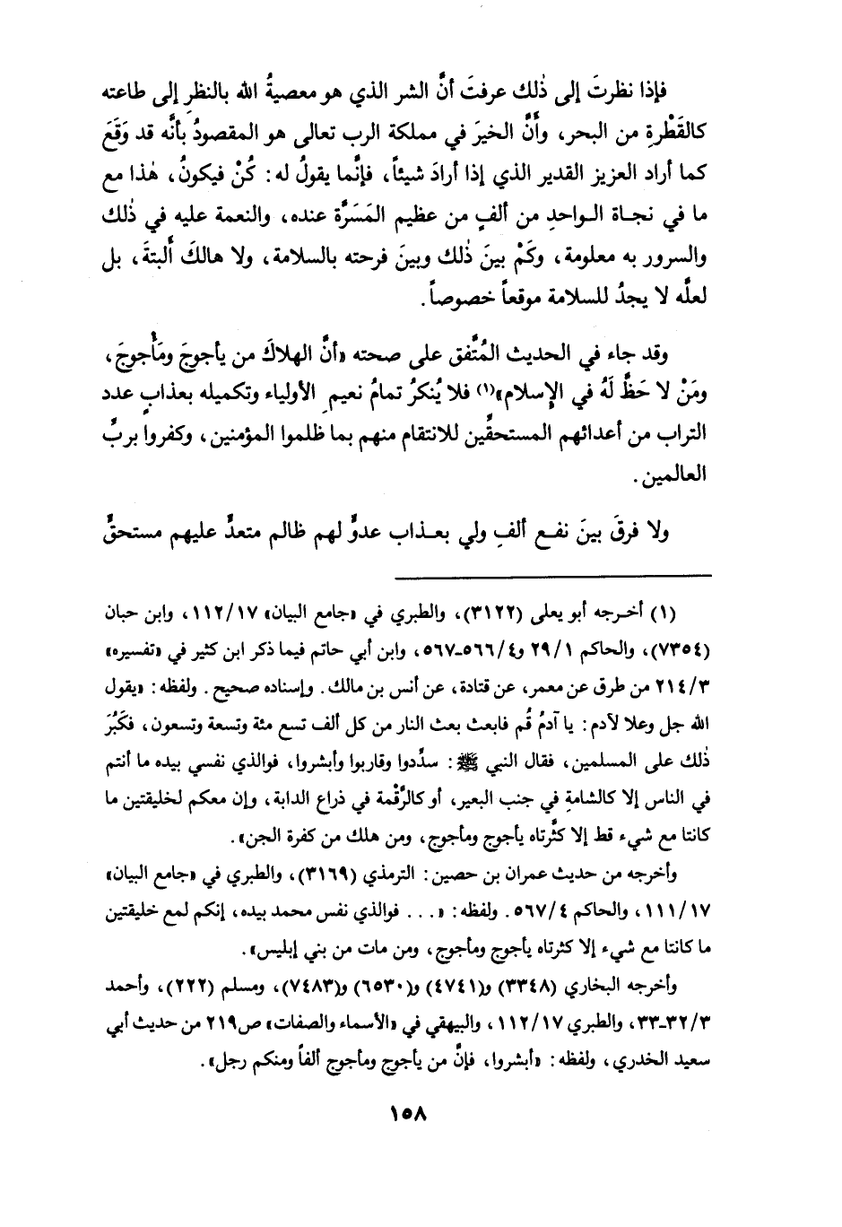 وقد جاء في الحديث المُتَّفق على صحته " أن الهلاك من يأجوجَ ومأجوج، ومن لا حَظَّ له في الإسلام " (¬1) فلا يُنكر تمام نعيم الأولياء وتكميله بعذابٍ عدد التراب من أعدائهم المستحقِّين للانتقام منهم بما ظلموا المؤمنين، وكفروا بربِّ العالمين.