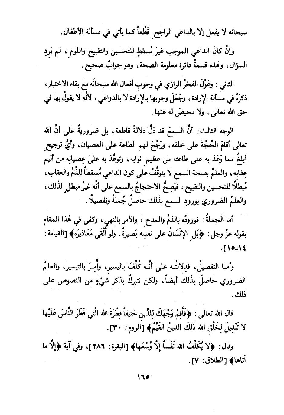 الوجه الثالث: أن السمع قد دلَّ دلالةً قاطعة، بل ضرورية على أن الله تعالى أقام الحجة على خلقه، ورجَّح لهم الطاعة على العصيان، وأيُّ ترجيحٍ أبلغ مما وعد به على طاعته من عظيم ثوابه، وتوعَّد به على عصيانه من أليم عقابه، والعلم بصحة السمع لا يتوقَّف على كون الداعي مُسقطاً للذَّمِّ والعقاب، مُبطلاً للتحسين والتقبيح، فيصح الاحتجاج بالسمع على أنه غير مبطلٍ لذلك، والعلم الضروري بورود السمع بذلك حاصلٌ جُملةً وتفصيلاً.
