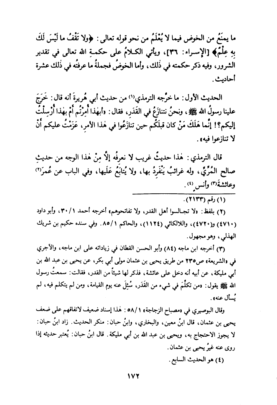 ما يمنع من الخوض فيما لا يُعلم من نحو قوله تعالى: {ولا تَقْفُ ما ليس لك به عِلْمٌ} [الإسراء: 36]، ويأتي الكلام على حكمة الله تعالى في تقدير الشرور، وفيه ذكر حكمته في ذلك، وأما الخوض فجملة ما عرفته في ذلك عشرة أحاديث.