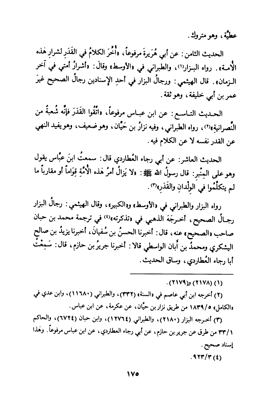 الحديث التاسع: عن ابن عباس مرفوعاً، " اتقوا القدر فإنه شُعبة من النصرانية " (¬2)، رواه الطبراني، وفيه نزار بن حيَّان، وهو ضعيف، وهو يفيد النهي عن القدر نفسه لا عن الكلام فيه.