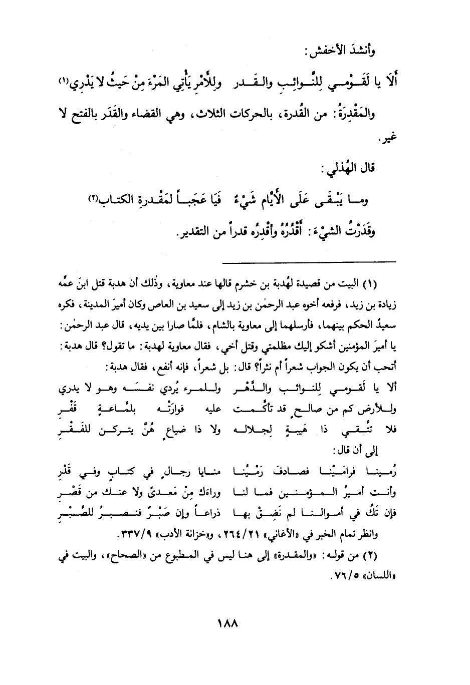 (¬1) البيت من قصيدة لهُدبة بن خشرم قالها عند معاوية، وذلك أن هدبة قتل ابنَ عمه زيادة بن زيد، فرفعه أخوه عبد الرحمن بن زيد إلى سعيد بن العاص وكان أمير المدينة، فكره سعيدٌ الحكم بينهما، فأرسلهما إلى معاوية بالشام، فلما صارا بين يديه، قال عبد الرحمن: يا أمير المؤمنين أشكو إليك مظلمتي وقتل أخي، فقال معاوية لهدبة: ما تقول؟ قال هدبة: أتحب أن يكون الجواب شعراً أم نثراً؟ قال: بل شعراً، فإنه أنفع، فقال هدبة: