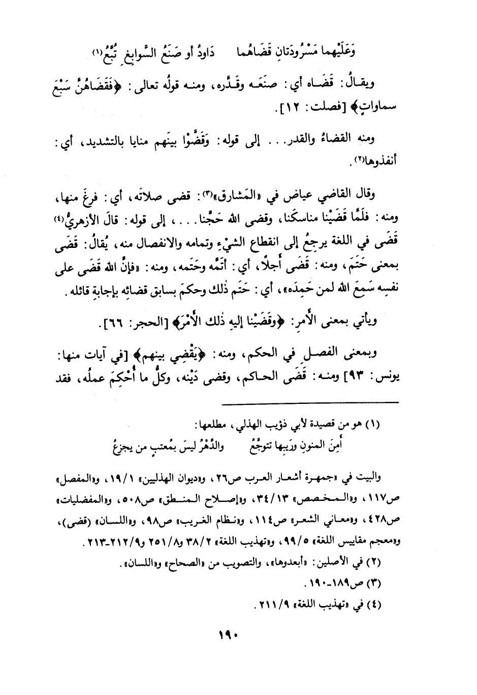 والبيت في " جمهرة أشعار العرب " ص 26، و" ديوان الهذليين " 1/ 19، والمفصل " ص 117، و" المخصص " 13/ 34، و" إصلاح المنطق " ص 508، و" المفضليات " ص 428، و" معاني الشعر " ص 114، و" نظام الغريب " ص 98، و" اللسان " (قضى)، و" معجم مقاييس اللغة " 5/ 99، و" تهذيب اللغة " 2/ 38 و8/ 251 و9/ 212 - 213.