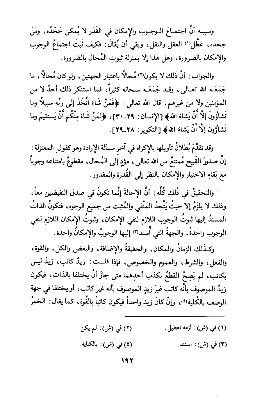 وسببه أن اجتماع الوجوب والإمكان في القدر لا يمكن جَحْدُه، ومن جحده، عطَّل (¬1) العقل والنقل، وبقي أن يُقال: فكيف ثبت اجتماع الوجوب والإمكان بالضرورة، وهل هذا إلاَّ بمنزلة ثبوت المحال بالضرورة.