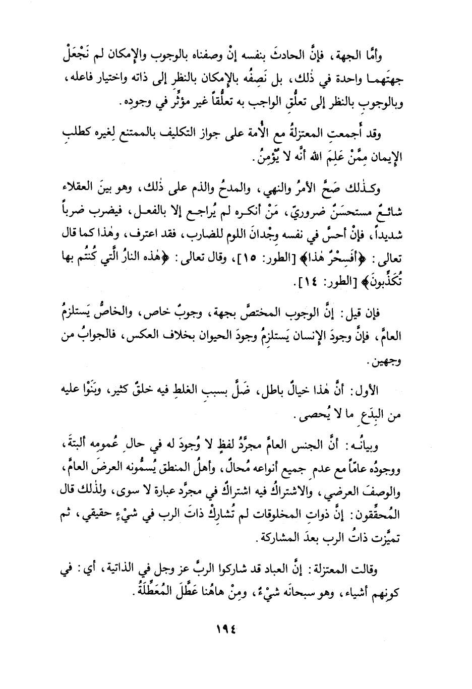 وكذلك صحَّ الأمر والنهي، والمدح والذم على ذلك، وهو بينَ العقلاء شائعٌ مستحسنٌ ضروري، من أنكره لم يُراجع إلاَّ بالفعل، فيضرب ضرباً شديداً، فإن أحسَّ في نفسه وِجْدان اللوم للضارب، فقد اعترف، وهذا كما قال تعالى: {أفَسِحْرٌ هذا} [الطور: 15]، وقال تعالى: {هذه النارُ الَّتي كُنتُم بها تُكَذِّبونَ} [الطور: 14].