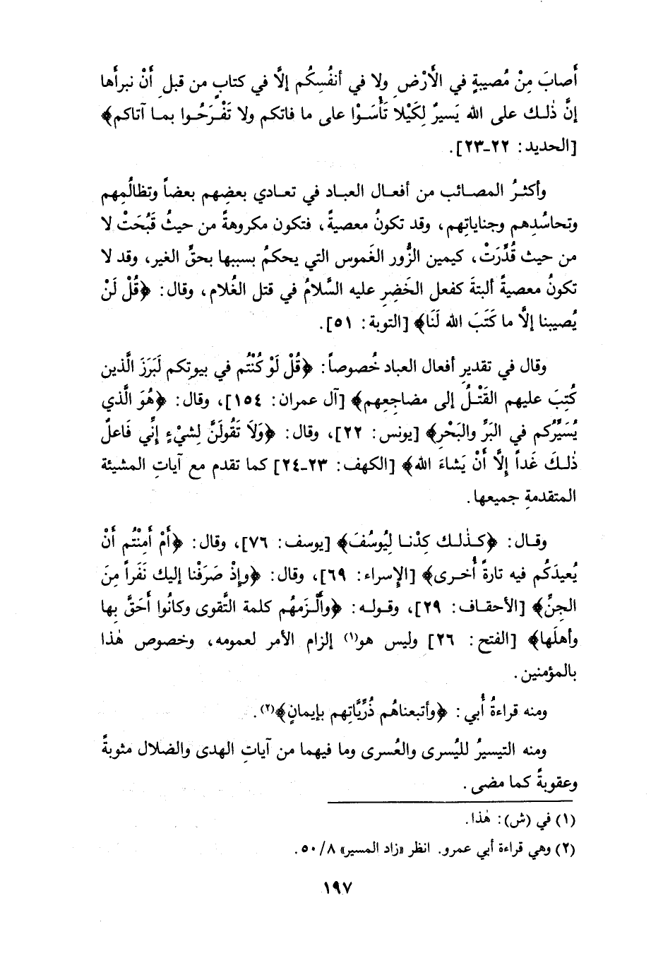 وقال في تقدير أفعال العباد خُصوصاً: {قُلْ لَوْ كُنْتُمْ فِي بُيُوتِكُمْ لَبَرَزَ الَّذِينَ كُتِبَ عَلَيْهِمُ الْقَتْلُ إِلَى مَضَاجِعِهِمْ} [آل عمران: 154]، وقال: {هُوَ الَّذي يُسَيِّرُكم في البَرِّ والبَحْرِ} [يونس: 22]، وقال: {وَلَا تَقُولَنَّ لِشَيْءٍ إِنِّي فَاعِلٌ ذَلِكَ غَدًا (23) إِلَّا أَنْ يَشَاءَ اللَّهُ} [الكهف: 23 - 24] كما تقدم مع آيات المشيئة المتقدمة جميعها.