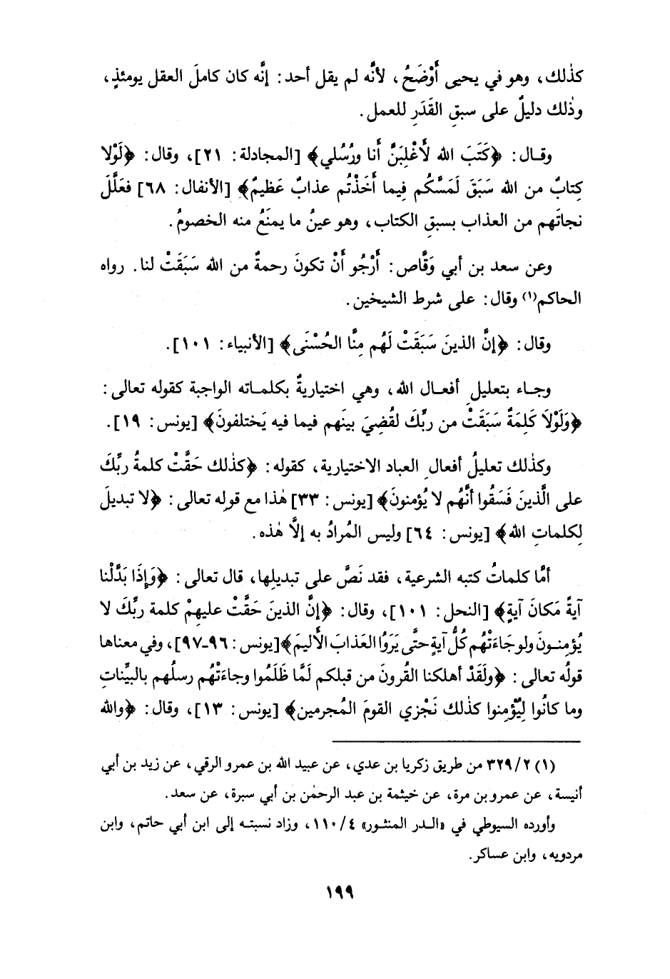 وقال: {كَتَبَ الله لأغْلِبَنَّ أنا ورُسُلي} [المجادلة: 21]، وقال: {لَوْلَا كِتَابٌ مِنَ اللَّهِ سَبَقَ لَمَسَّكُمْ فِيمَا أَخَذْتُمْ عَذَابٌ عَظِيمٌ} [الأنفال: 68] فعلَّلَ نجاتهم من العذاب بسبق الكتاب، وهو عين ما يمنع منه الخصوم.