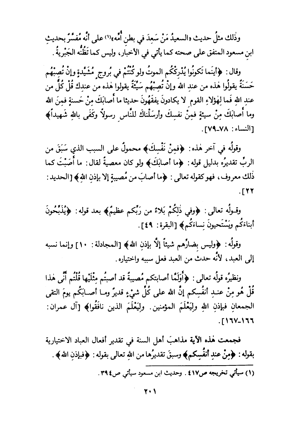 وقال: {أَيْنَمَا تَكُونُوا يُدْرِكْكُمُ الْمَوْتُ وَلَوْ كُنْتُمْ فِي بُرُوجٍ مُشَيَّدَةٍ وَإِنْ تُصِبْهُمْ حَسَنَةٌ يَقُولُوا هَذِهِ مِنْ عِنْدِ اللَّهِ وَإِنْ تُصِبْهُمْ سَيِّئَةٌ يَقُولُوا هَذِهِ مِنْ عِنْدِكَ قُلْ كُلٌّ مِنْ عِنْدِ اللَّهِ فَمَالِ هَؤُلَاءِ الْقَوْمِ لَا يَكَادُونَ يَفْقَهُونَ حَدِيثًا (78) مَا أَصَابَكَ مِنْ حَسَنَةٍ فَمِنَ اللَّهِ وَمَا أَصَابَكَ مِنْ سَيِّئَةٍ فَمِنْ نَفْسِكَ وَأَرْسَلْنَاكَ لِلنَّاسِ رَسُولًا وَكَفَى بِاللَّهِ شَهِيدًا} [النساء: 78 - 79].
