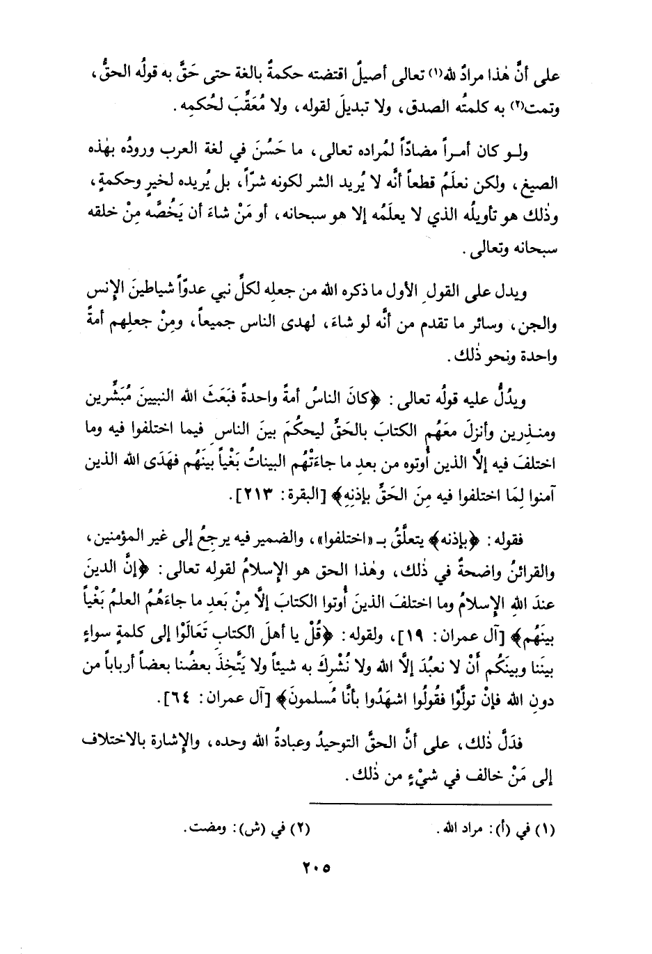 فقوله: {بإذنه} يتعلق بـ " اختلفوا "، والضمير فيه يرجع إلى غير المؤمنين، والقرائن واضحةٌ في ذلك، وهذا الحق هو الإسلام لقوله تعالى: {إِنَّ الدِّينَ عِنْدَ اللَّهِ الْإِسْلَامُ وَمَا اخْتَلَفَ الَّذِينَ أُوتُوا الْكِتَابَ إِلَّا مِنْ بَعْدِ مَا جَاءَهُمُ الْعِلْمُ بَغْيًا بَيْنَهُمْ} [آل عمران: 19]، ولقوله: {قُلْ يَا أَهْلَ الْكِتَابِ تَعَالَوْا إِلَى كَلِمَةٍ سَوَاءٍ بَيْنَنَا وَبَيْنَكُمْ أَلَّا نَعْبُدَ إِلَّا اللَّهَ وَلَا نُشْرِكَ بِهِ شَيْئًا وَلَا يَتَّخِذَ بَعْضُنَا بَعْضًا أَرْبَابًا مِنْ دُونِ اللَّهِ فَإِنْ تَوَلَّوْا فَقُولُوا اشْهَدُوا بِأَنَّا مُسْلِمُونَ} [آل عمران: 64].