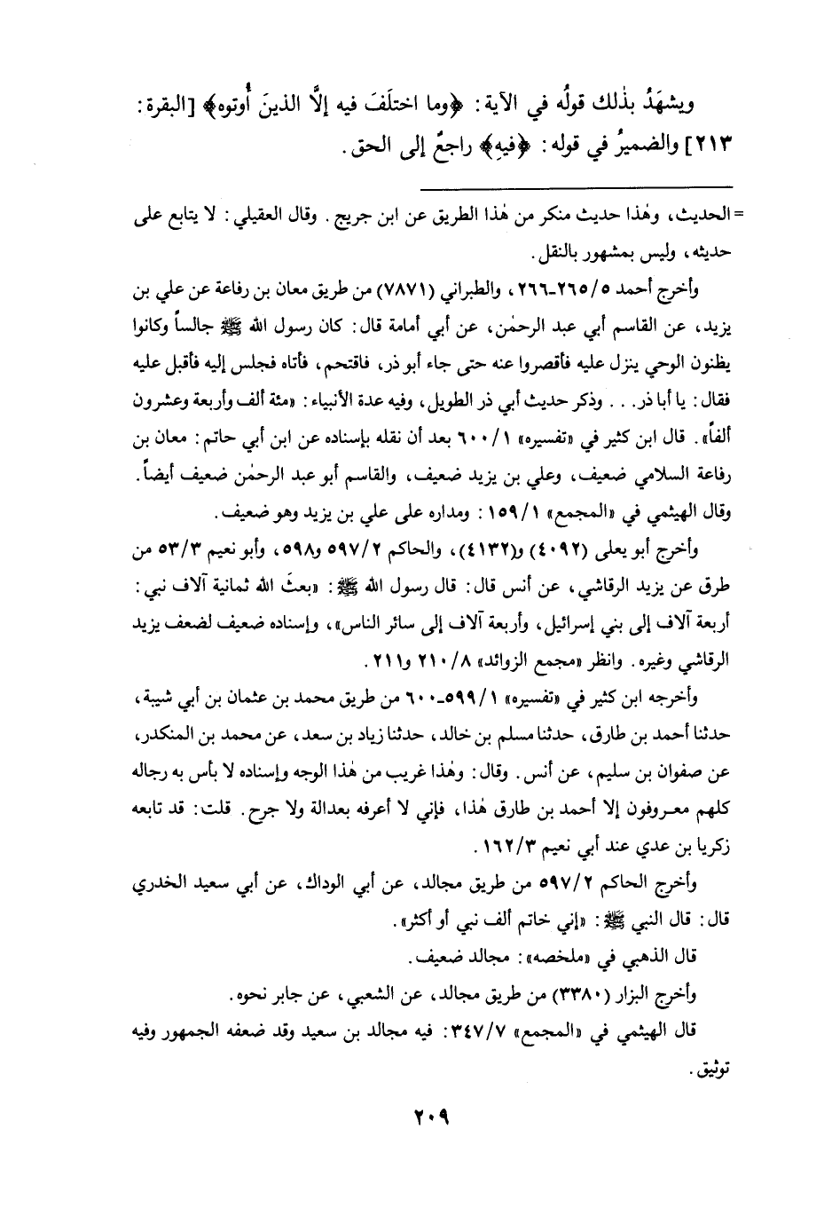 وأخرج أحمد 5/ 265 - 266، والطبراني (7871) من طريق معان بن رفاعة عن علي بن يزيد، عن القاسم أبي عبد الرحمن، عن أبي أمامة قال: كان رسول الله - صلى الله عليه وسلم - جالساً وكانوا يظنون الوحي ينزل عليه فأقصروا عنه حتى جاء أبو ذر، فاقتحم، فأتاه فجلس إليه فأقبل عليه فقال: يا أبا ذر ... وذكر حديث أبي ذر الطويل، وفيه عدة الأنبياء: " مئة ألف وأربعة وعشرون ألفاً ". قال ابن كثير في " تفسيره " 1/ 600 بعد أن نقله بإسناده عن ابن أبي حاتم: معان بن رفاعة السلامي ضعيف، وعلي بن يزيد ضعيف، والقاسم أبو عبد الرحمن ضعيف أيضاً.