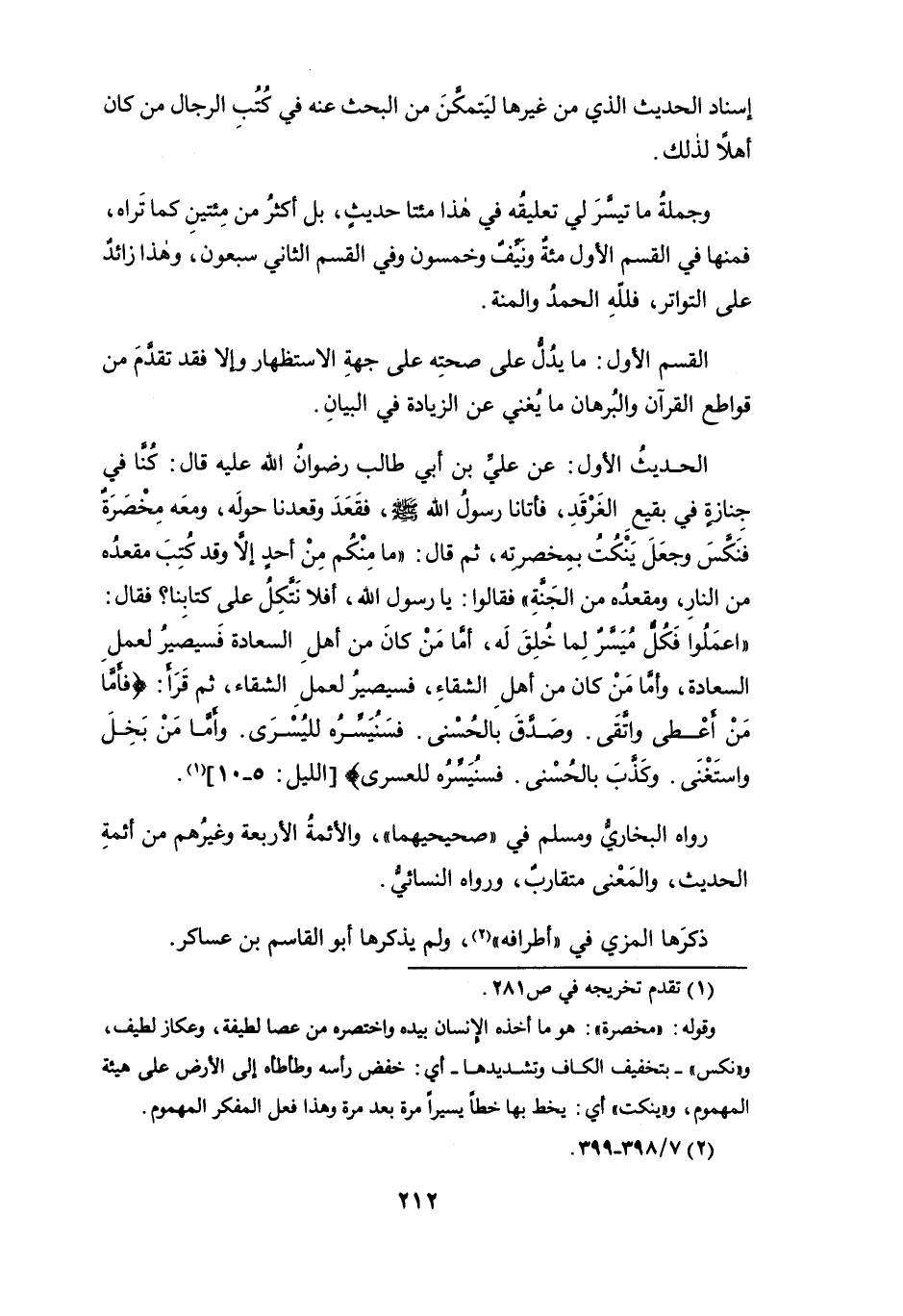 الحديث الأول: عن عليِّ بن أبي طالب رضوان الله عليه قال: كنا في جنارةٍ في بقيع الغَرْقَد، فأتانا رسول الله - صلى الله عليه وسلم -، فقعد وقعدنا حوله، ومعه مِخْصَرَةٌ فنكَّس وجعل يَنْكُتُ بمِخصرتِه، ثم قال: " ما منكم من أحدٍ إلاَّ وقد كُتِب مقعدُه من النار، ومقعده من الجنة " فقالوا: يا رسول الله، أفلا نَتَّكِلُ على كتابنا؟ فقال: " اعملوا فكُلٌّ مُيَسَّرٌ لما خُلِقَ له، أمَّا من كان من أهل السعادة فسيصير لعمل السعادة، وأما من كان من أهل الشقاء، فسيصير لعمل الشقاء، ثم قرأ: {فَأَمَّا مَنْ أَعْطَى وَاتَّقَى (5) وَصَدَّقَ بِالْحُسْنَى (6) فَسَنُيَسِّرُهُ لِلْيُسْرَى (7) وَأَمَّا مَنْ بَخِلَ وَاسْتَغْنَى (8) وَكَذَّبَ بِالْحُسْنَى (9) فَسَنُيَسِّرُهُ لِلْعُسْرَى} [الليل: 5 - 10] (¬1).