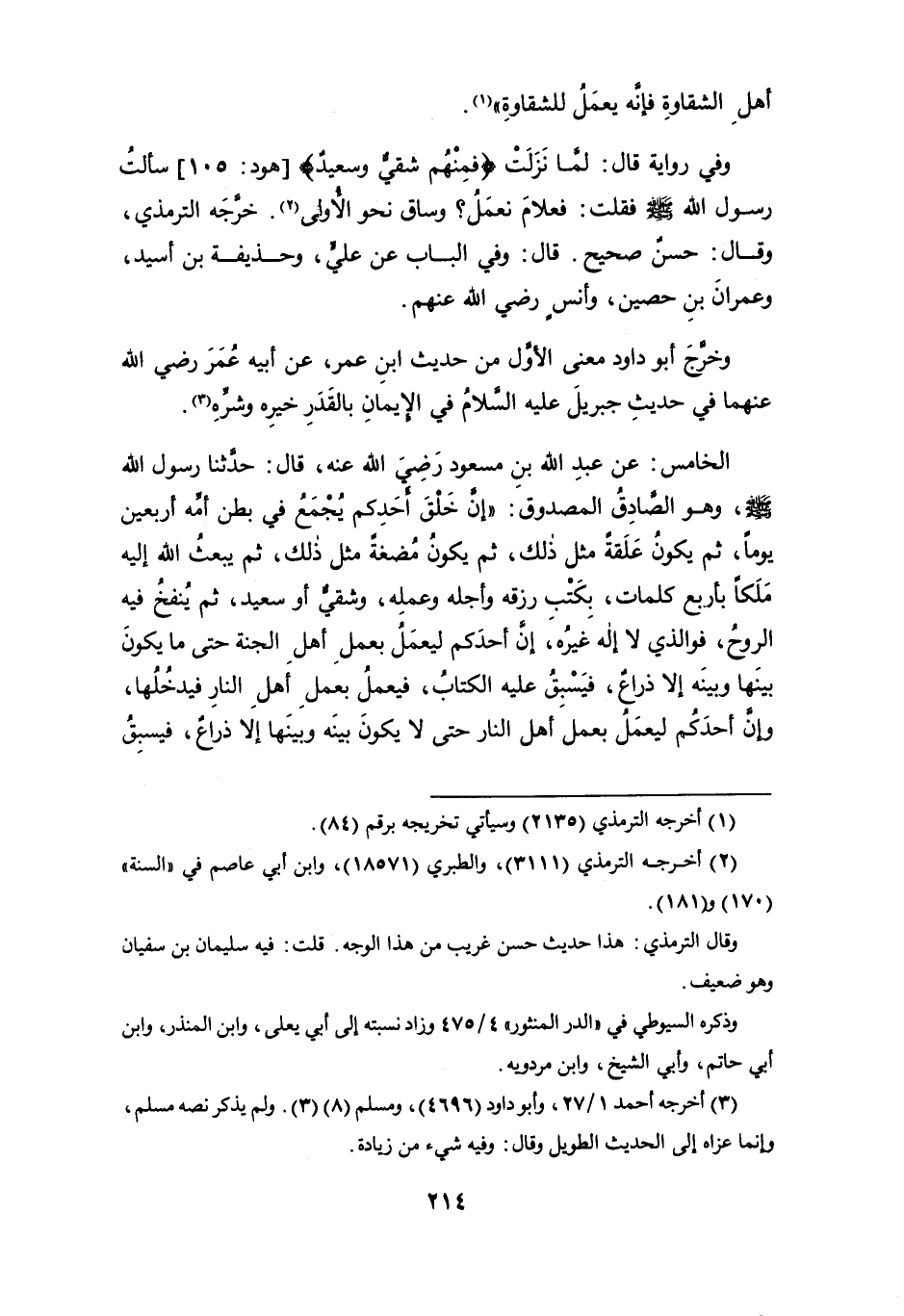 الخامس: عن عبد الله بن مسعود رضي الله عنه، قال: حدثنا رسول الله - صلى الله عليه وسلم -، وهو الصادق المصدوق: "إن خلق أحدكم يُجمع في بطن أمه أربعين يوماً، ثم يكون علقةً مثل ذلك، ثم يكون مضغةً مثل ذلك، ثم يبعث الله إليه مَلَكاً بأربع كلمات، بِكَتْبِ رزقه وأجله وعمله، وشقي أو سعيد، ثم يُنفخ فيه الروح، فوالذي لا إله غيره، إن أحدكم ليعمل بعمل أهل الجنة حتى ما يكون بينها وبينه إلاَّ ذراعٌ، فيَسْبِق عليه الكتاب، فيعمل بعمل أهل النار فيدخلها، وإن أحدكم ليعمل بعمل أهل النار حتى لا يكون بينه وبينها إلاَّ ذراعٌ، فيسبق