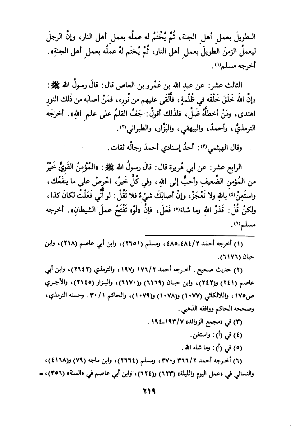 الثالث عشر: عن عبد الله بن عمرو بن العاص قال: قال رسول الله - صلى الله عليه وسلم -: " إن الله خلق خلقه في ظُلمةٍ، فألقى عليهم من نوره، فمن أصابه من ذلك النور اهتدى، ومن أخطأه ضَلَّ، فلذلك أقول: جَفَّ القلم على علم الله ". أخرجه الترمذي، وأحمد، والبيهقي، والبزار، والطبراني (¬2).