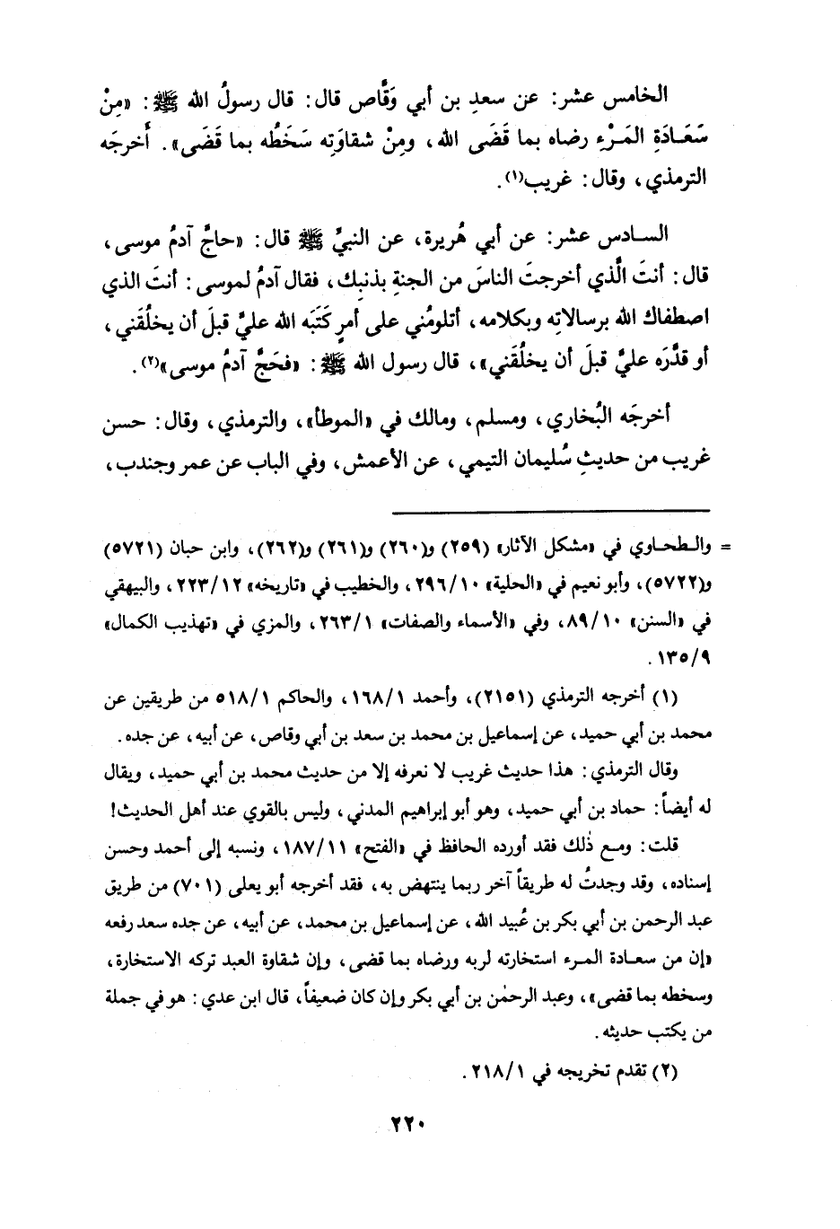 الخامس عشر: عن سعد بن أبي وقاص قال: قال رسول الله - صلى الله عليه وسلم -: " من سعادة المرء رضاه بما قضى الله، ومن شقاوته سَخَطُه بما قضى ". أخرجه الترمذي، وقال: غريب (¬1).