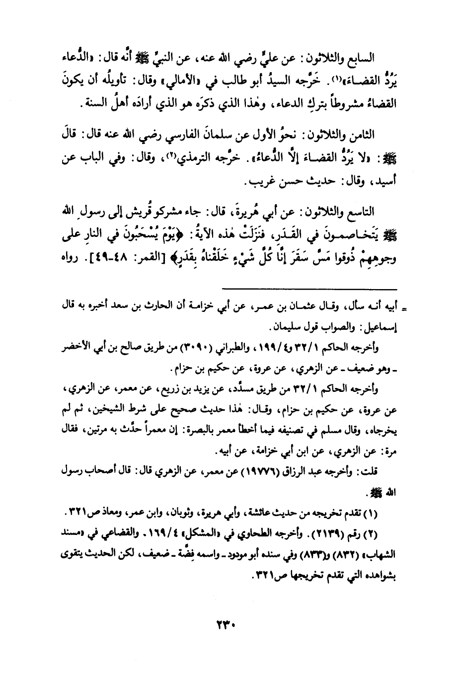 التاسع والثلاثون: عن أبي هريرة، قال: جاء مشركو قريش إلى رسول الله - صلى الله عليه وسلم - يتخاصمون في القدر، فنزلت هذه الآية: {يَوْمَ يُسْحَبُونَ فِي النَّارِ عَلَى وُجُوهِهِمْ ذُوقُوا مَسَّ سَقَرَ (48) إِنَّا كُلَّ شَيْءٍ خَلَقْنَاهُ بِقَدَرٍ} [القمر: 48 - 49]. رواه