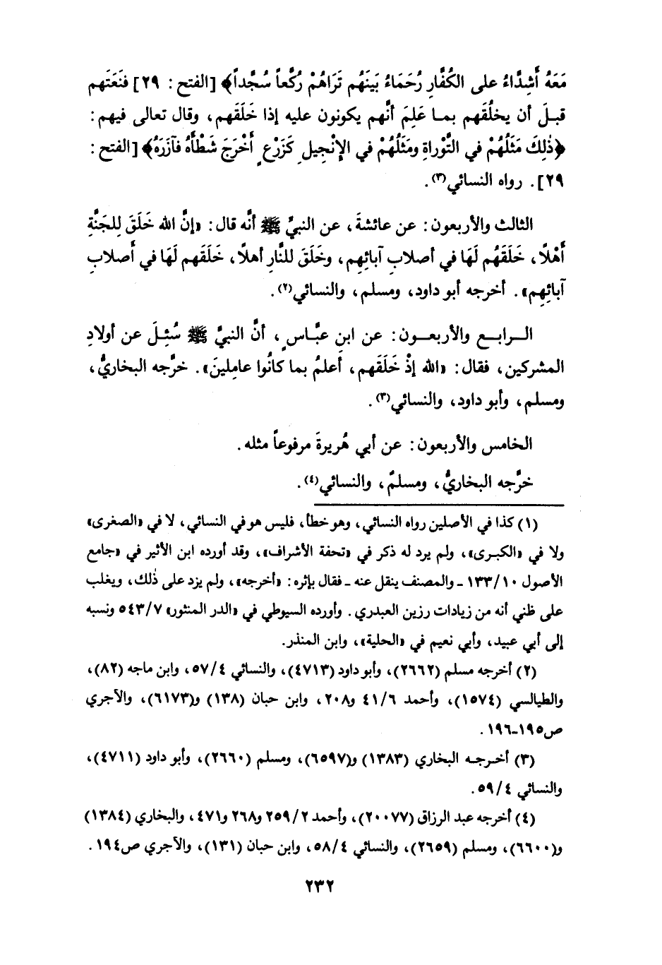 الرابع والأربعون: عن ابن عباس، أن النبي - صلى الله عليه وسلم - سُئِلَ عن أولاد المشركين، فقال: " الله إذ خلقهم، أعلم بما كانوا عاملين ". خرجه البخاري، ومسلم، وأبو داود، والنسائي (¬3).