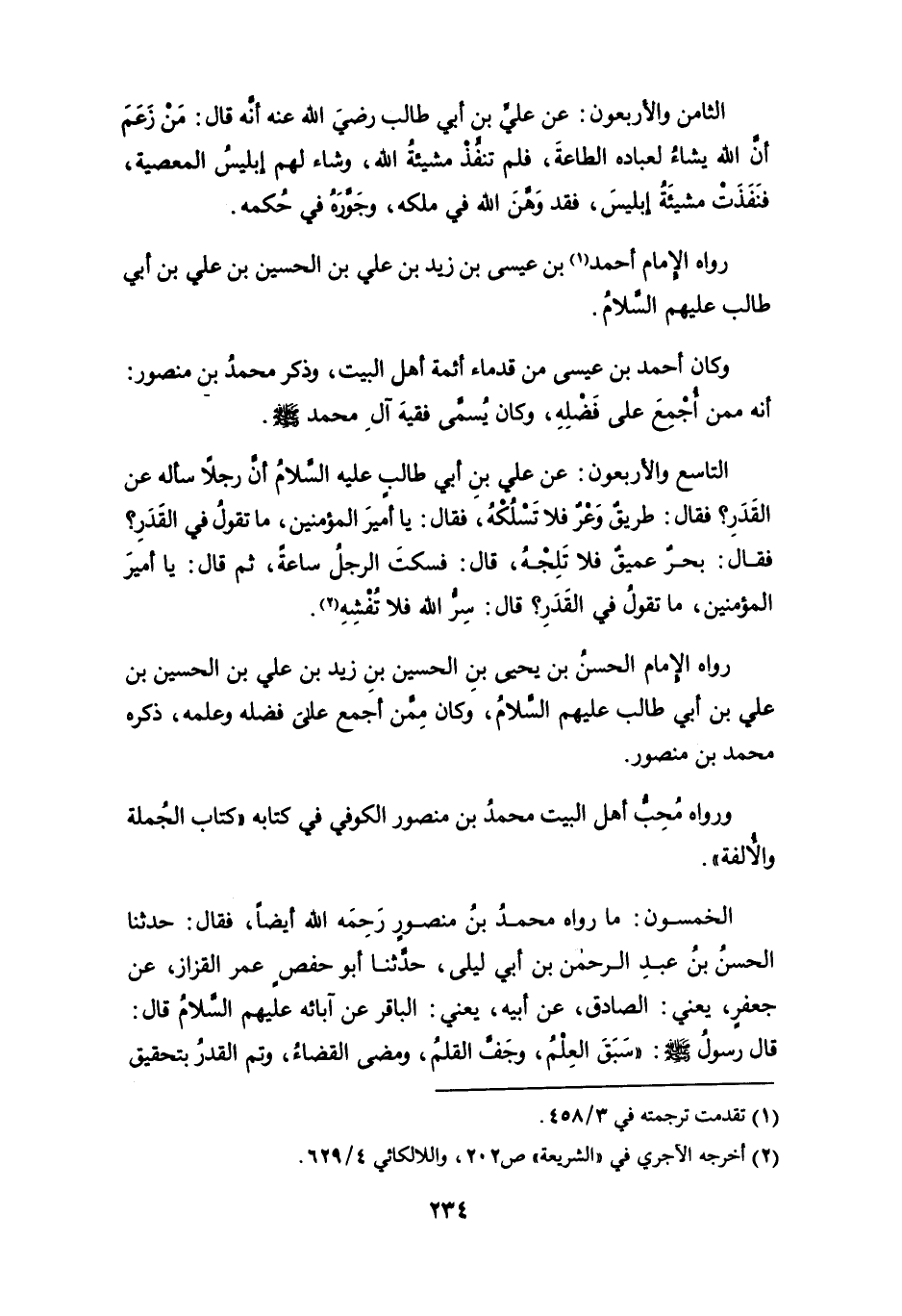 الخمسون: ما رواه محمد بن منصور رحمه الله أيضاً، فقال: حدثنا الحسن بن عبد الرحمن بن أبي ليلى، حدثنا أبو حفص عمر القزاز، عن جعفرٍ، يعني: الصادق، عن أبيه، يعني: الباقر عن آبائه عليهم السلام قال: قال رسول: "سبق العلم، وجفَّ القلم، ومضى القضاء وتم القدرُ بتحقيق