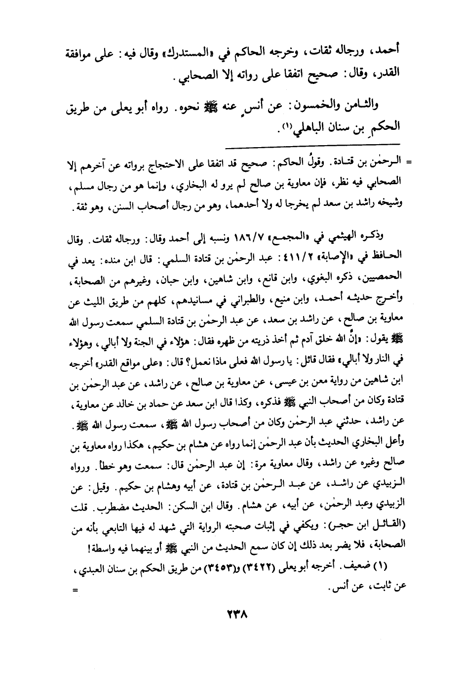= الرحمن بن قتادة. وقول الحكم: صحيح قد اتفقا على الاحتجاج برواته عن آخرهم إلا الصحابي فيه نظر، فإن معاوية بن صالح لم يرو له البخاري، وإنما هو من رجال مسلم، وشيخه راشد بن سعد لم يخرجا له ولا أحدهما، وهو من رجال أصحاب السنن، وهو ثقة.