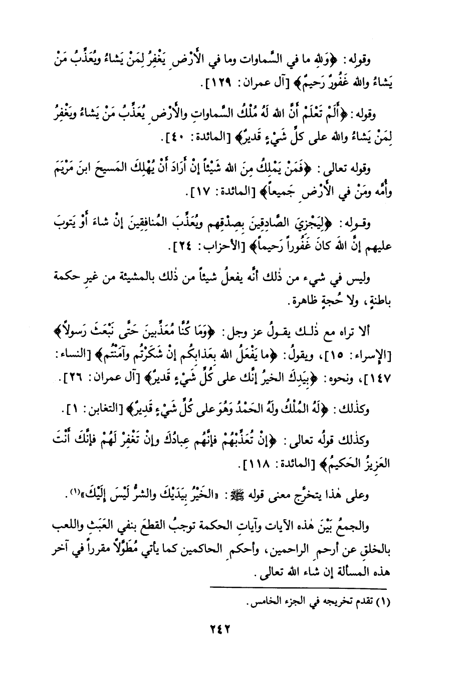 ألا تراه مع ذلك يقول عز وجل: {وَمَا كُنَّا مُعَذِّبِينَ حَتَّى نَبْعَثَ رَسُولًا} [الإسراء: 15]، ويقول: {مَا يَفْعَلُ اللَّهُ بِعَذَابِكُمْ إِنْ شَكَرْتُمْ وَآمَنْتُمْ} [النساء: 147]، ونحوه: {بِيَدِكَ الْخَيْرُ إِنَّكَ عَلَى كُلِّ شَيْءٍ قَدِيرٌ} [آل عمران: 26].